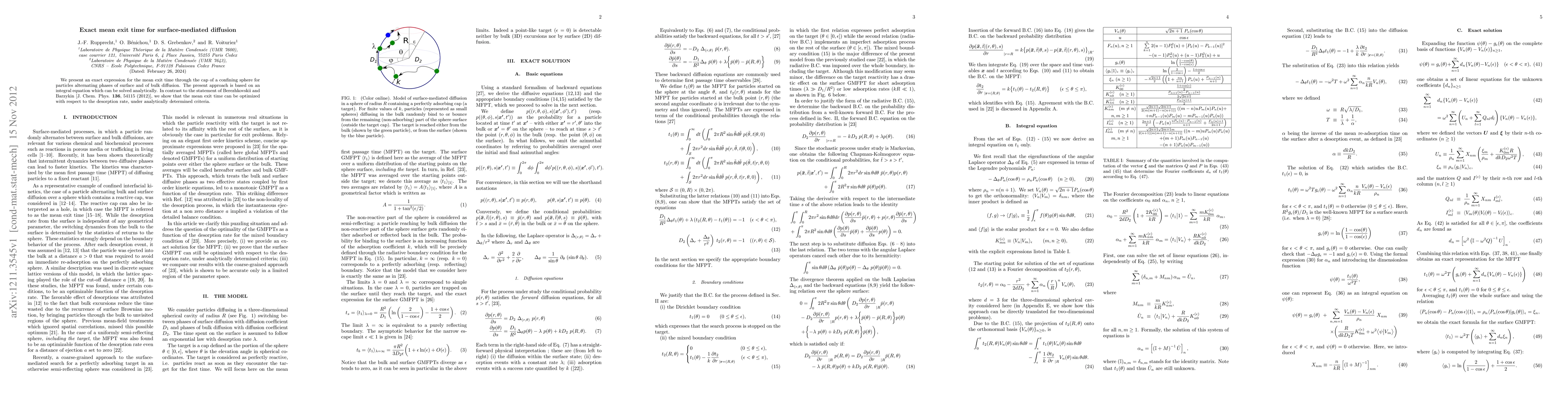 This paper provides an exact analytical expression for the mean exit time of particles undergoing surface and bulk diffusion via a confining sphere, demonstrating that the mean exit time can be optimized with respect to the desorption rate, contrary to previous claims.
