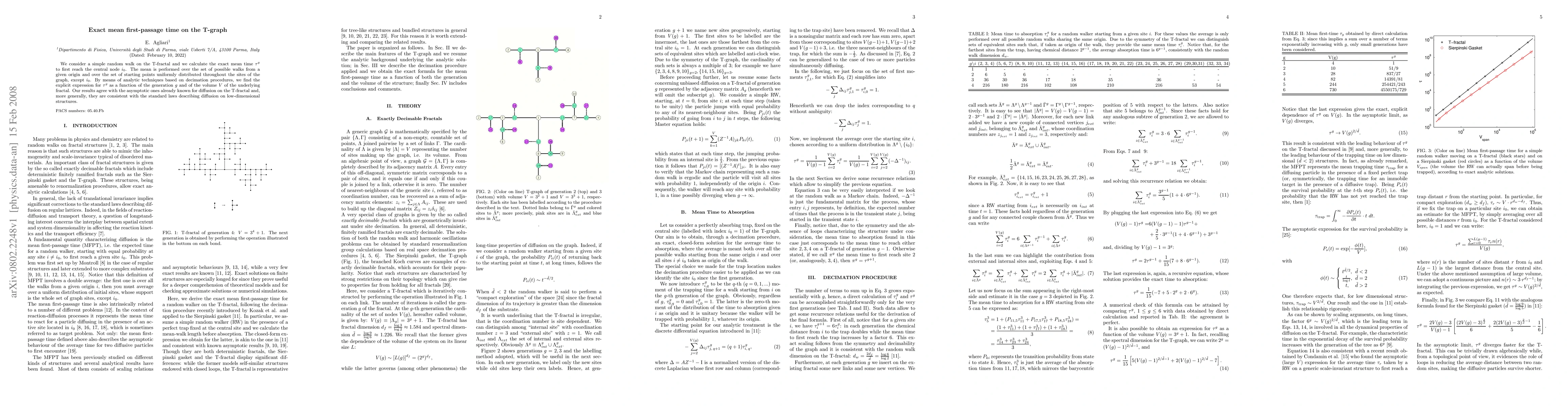 This paper calculates the exact mean first-passage time for a random walk on the T-fractal to reach its central node, deriving an explicit expression for this time based on fractal generation and volume. The results confirm known asymptotic behaviors and align with standard diffusion laws in low-dimensional structures.