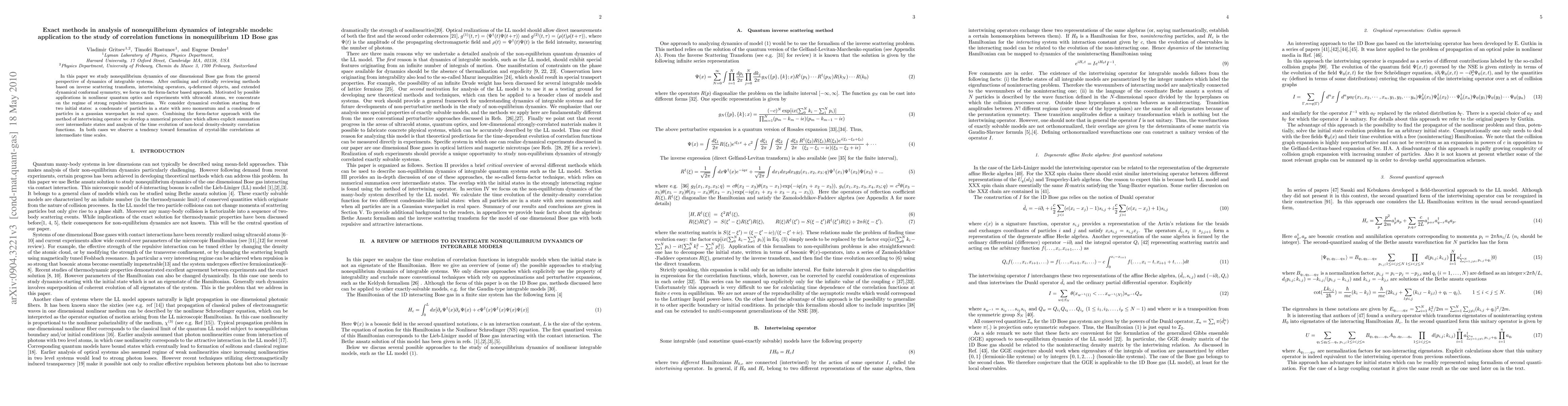 In this paper we study nonequilibrium dynamics of one dimensional Bose gas from the general perspective of dynamics of integrable systems. After outlining and critically reviewing methods based on inverse scattering transform, intertwining operators, q-deformed objects, and extended dynamical conformal symmetry, we focus on the form-factor based approach. Motivated by possible applications in nonlinear quantum optics and experiments with ultracold atoms, we concentrate on the regime of strong repulsive interactions. We consider dynamical evolution starting from two initial states: a condensate of particles in a state with zero momentum and a condensate of particles in a gaussian wavepacket in real space. Combining the form-factor approach with the method of intertwining operator we develop a numerical procedure which allows explicit summation over intermediate states and analysis of the time evolution of non-local density-density correlation functions. In both cases we observe a tendency toward formation of crystal-like correlations at intermediate time scales.