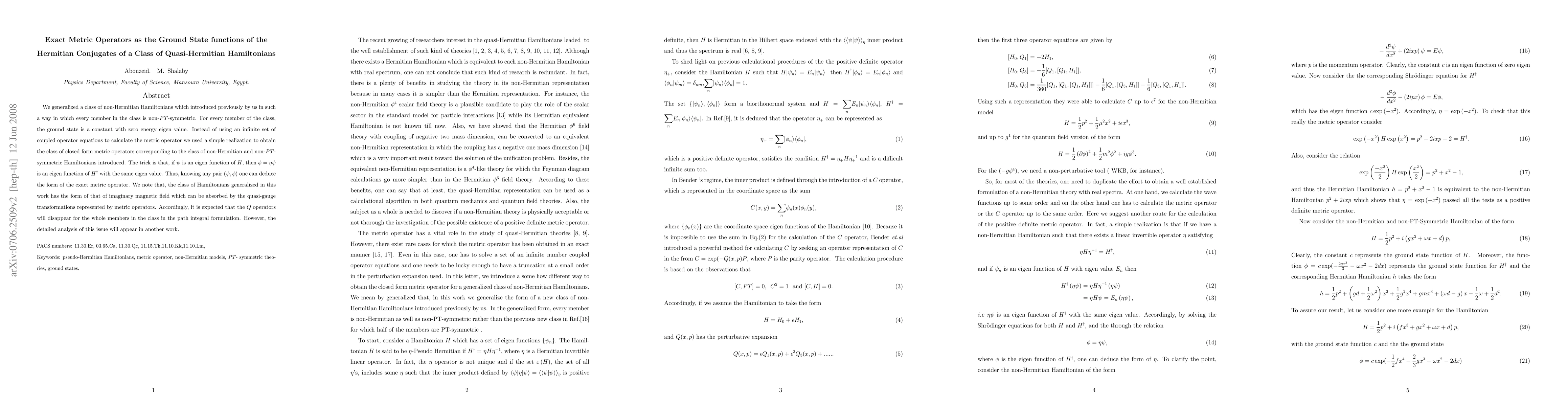 This paper generalizes a class of non-Hermitian, non-PT-symmetric Hamiltonians, where each member has a ground state with zero energy. The authors derive exact metric operators as ground state functions of the Hermitian conjugates of these Hamiltonians, using a simple realization instead of coupled operator equations.