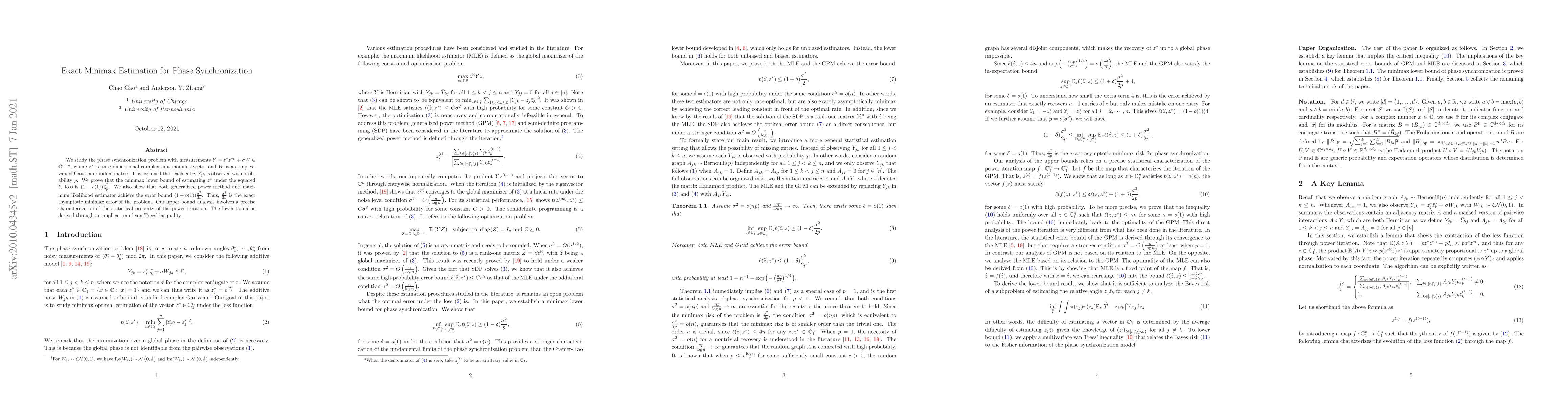 Researchers have discovered that the exact minimax error for estimating phase synchronization is (1-o(1))² ¢/2p, where p is the probability of observing each entry in the measurement Y.