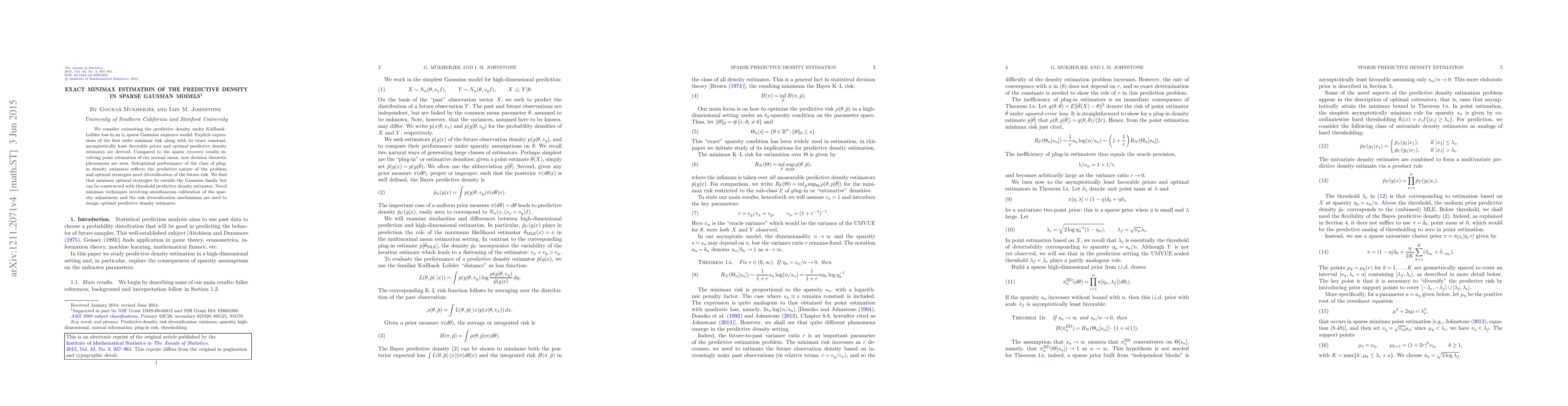 This paper derives exact minimax risk expressions and optimal predictive density estimates for sparse Gaussian models under Kullback-Leibler loss, revealing that minimax optimal strategies lie outside the Gaussian family and require threshold predictive density estimates. Novel techniques are introduced for simultaneous calibration of sparsity and risk diversification.