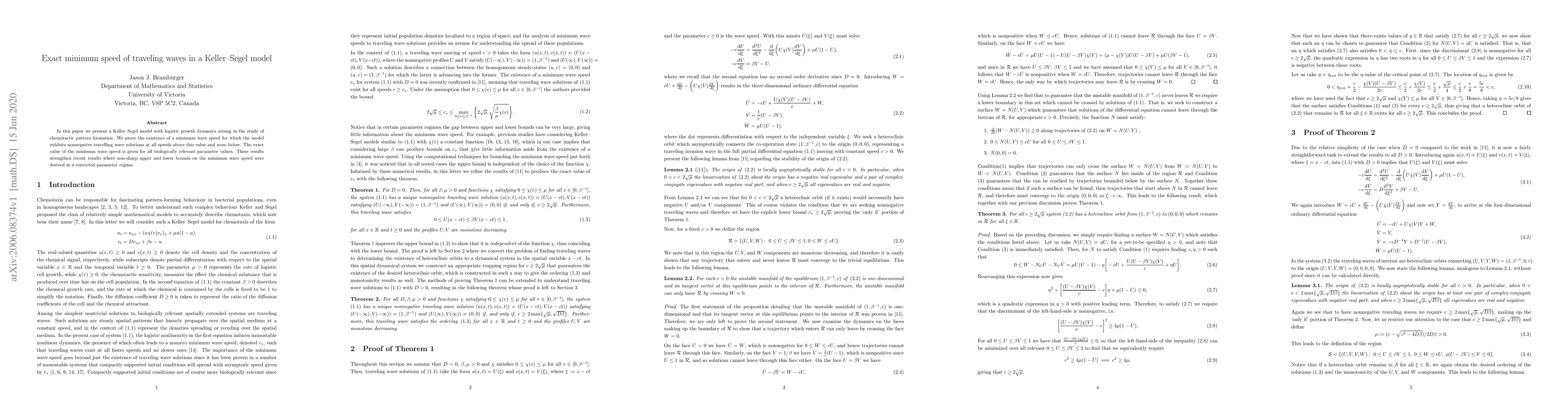 In this paper we present a Keller--Segel model with logistic growth dynamics arising in the study of chemotactic pattern formation. We prove the existence of a minimum wave speed for which the model exhibits nonnegative travelling wave solutions at all speeds above this value and none below. The exact value of the minimum wave speed is given for all biologically relevant parameter values. These results strengthen recent results where non-sharp upper and lower bounds on the minimum wave speed were derived in a restricted parameter regime.