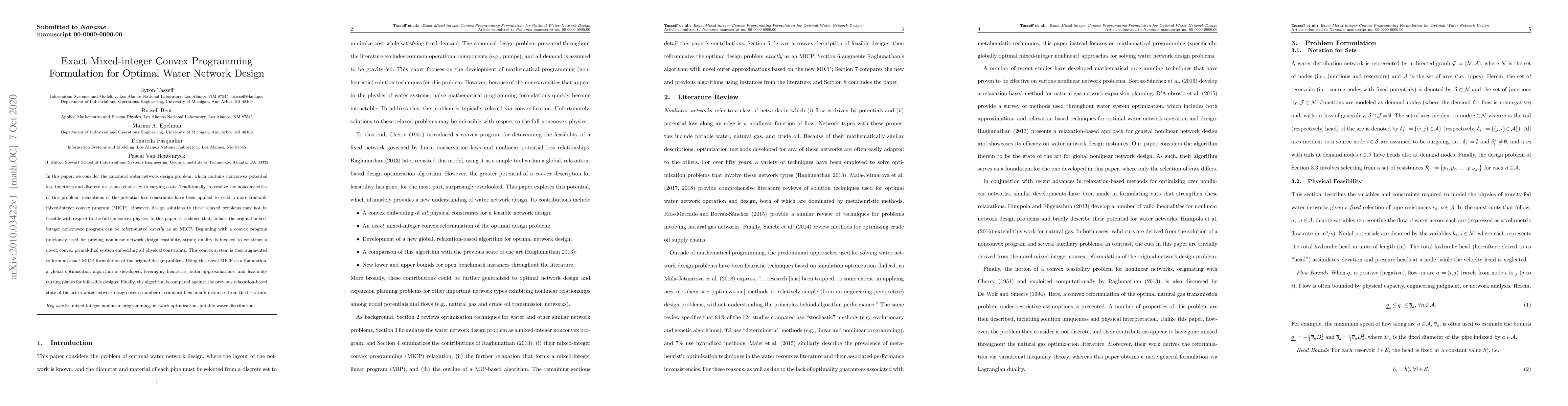 This paper reformulates the original mixed-integer nonconvex water network design problem as an exact mixed-integer convex program (MICP) using a novel convex primal-dual system, and develops a global optimization algorithm to solve it. The new MICP formulation and algorithm outperform traditional relaxation-based methods on benchmark instances.