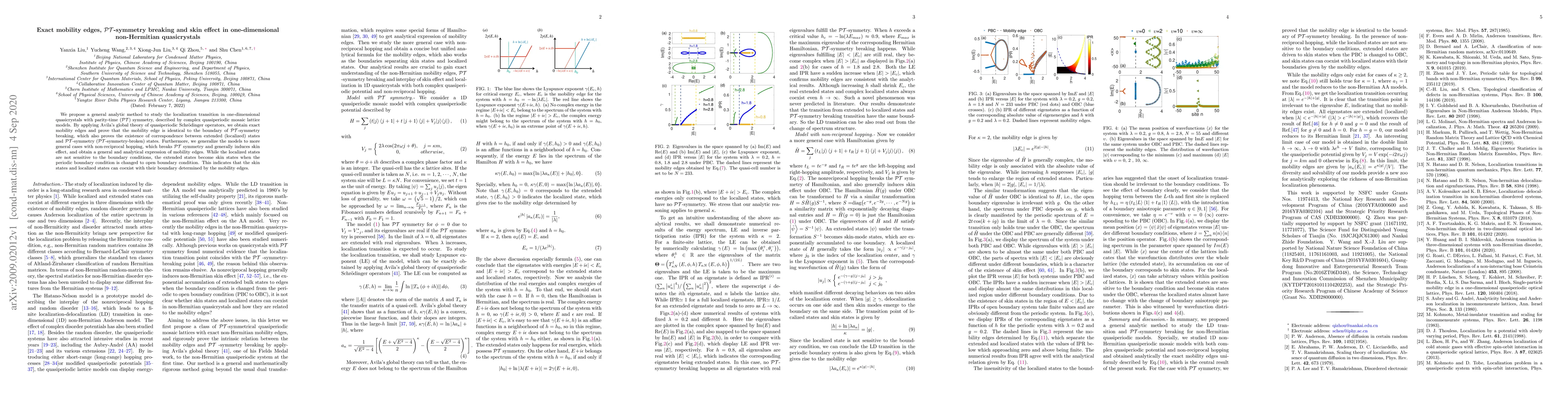 This paper proposes an analytic method to study localization in one-dimensional quasicrystals with $\mathcal{PT}$ symmetry, revealing exact mobility edges and the connection between $\mathcal{PT}$-symmetry breaking and localization. It also explores the skin effect in models with non-reciprocal hopping.
