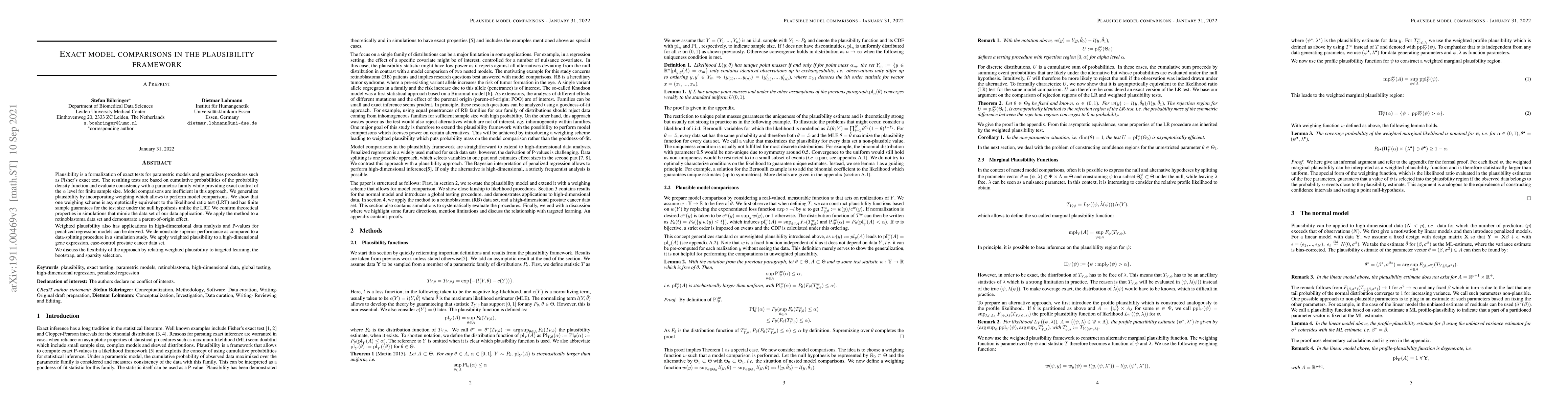 Plausibility is a formalization of exact tests for parametric models and generalizes procedures such as Fisher's exact test. The resulting tests are based on cumulative probabilities of the probability density function and evaluate consistency with a parametric family while providing exact control of the $\alpha$ level for finite sample size. Model comparisons are inefficient in this approach. We generalize plausibility by incorporating weighing which allows to perform model comparisons. We show that one weighing scheme is asymptotically equivalent to the likelihood ratio test (LRT) and has finite sample guarantees for the test size under the null hypothesis unlike the LRT. We confirm theoretical properties in simulations that mimic the data set of our data application. We apply the method to a retinoblastoma data set and demonstrate a parent-of-origin effect. Weighted plausibility also has applications in high-dimensional data analysis and P-values for penalized regression models can be derived. We demonstrate superior performance as compared to a data-splitting procedure in a simulation study. We apply weighted plausibility to a high-dimensional gene expression, case-control prostate cancer data set. We discuss the flexibility of the approach by relating weighted plausibility to targeted learning, the bootstrap, and sparsity selection.
