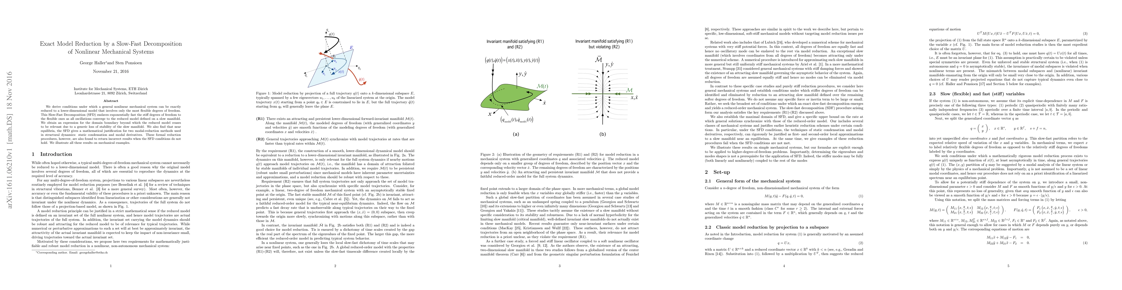 This paper develops conditions for exact model reduction of nonlinear mechanical systems using Slow-Fast Decomposition, ensuring the reduced model captures only the most flexible degrees of freedom. It also identifies the stability boundary beyond which the reduced model becomes invalid, and connects the method to static condensation and modal derivatives in structural dynamics.