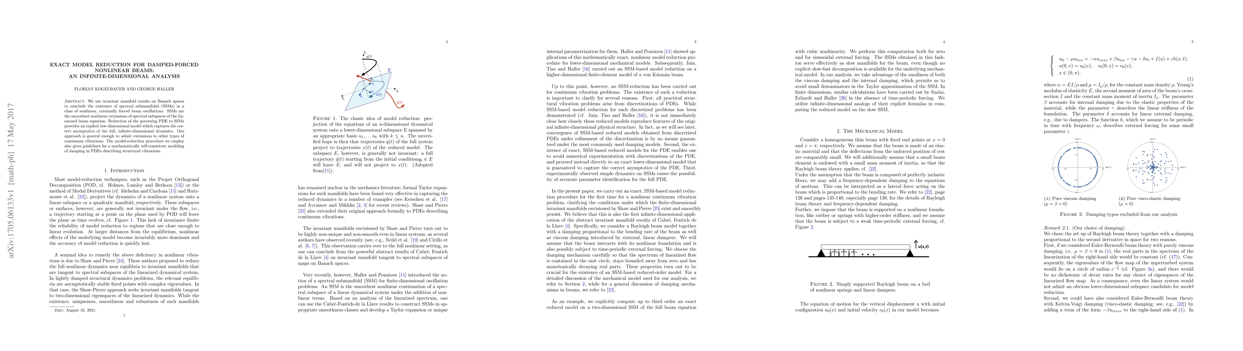 This paper develops a method for reducing the complexity of infinite-dimensional models of damped-forced nonlinear beams using spectral submanifolds. The approach provides a low-dimensional model that accurately captures the dynamics of the full system and is applicable to other types of continuum vibrations.