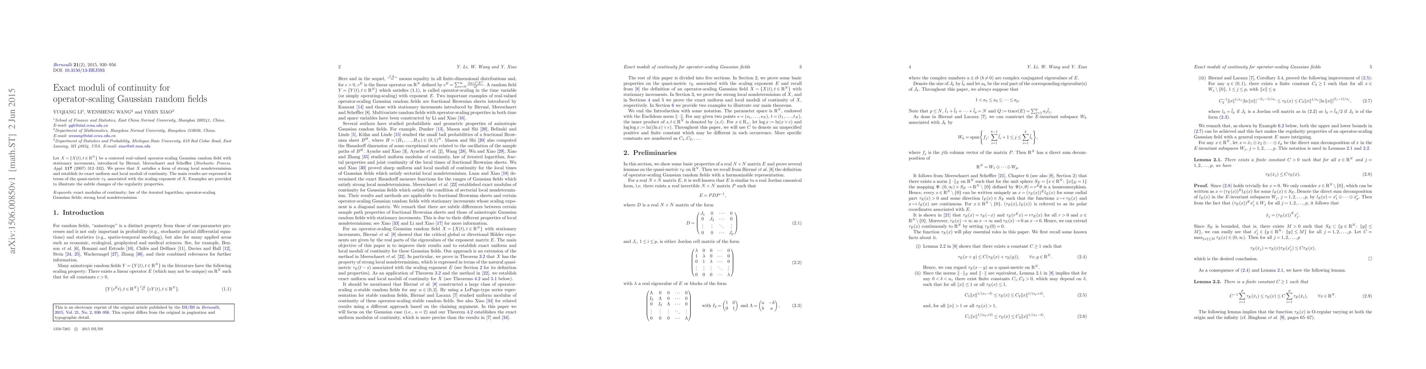 This paper establishes the exact uniform and local moduli of continuity for the operator-scaling Gaussian random field $X$ with stationary increments, proving strong local nondeterminism and expressing the results in terms of the associated quasi-metric $\tau_E$. Examples are used to demonstrate the nuanced changes in the field's regularity properties.