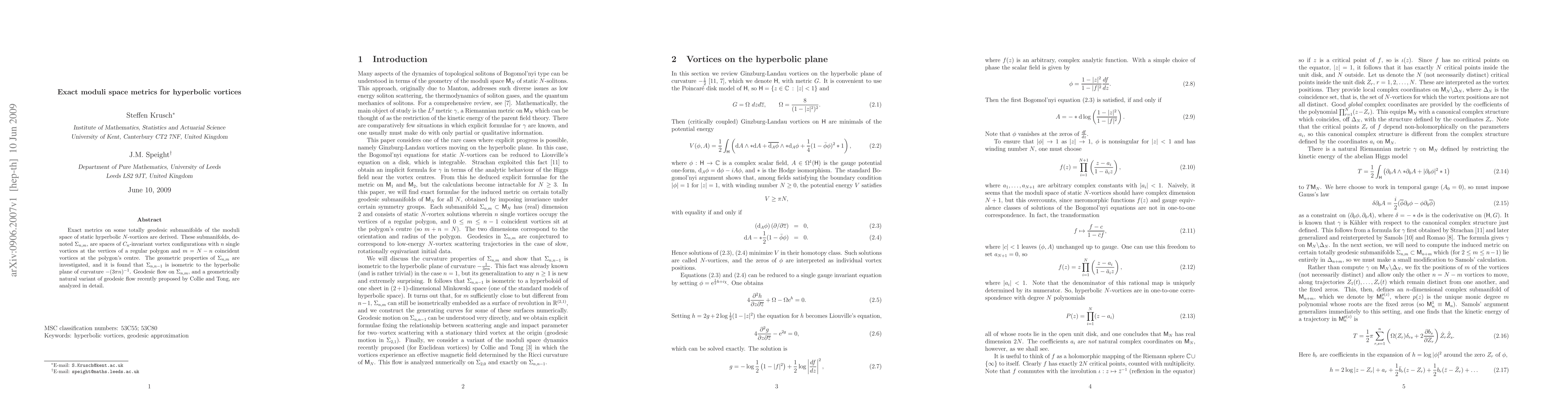 This paper derives exact metrics for specific submanifolds in the moduli space of static hyperbolic N-vortices, showing that \Sigma_{n,n-1} is isometric to a hyperbolic plane with curvature -1/(3πn). It also analyzes geodesic flows on these submanifolds and a related variant.