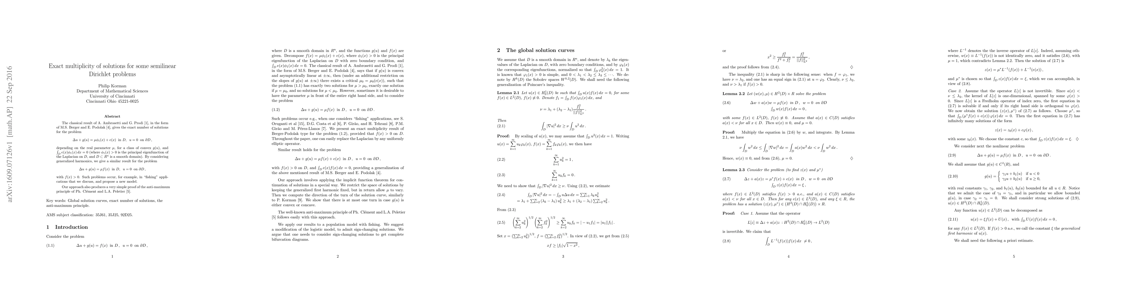 The classical result of A. Ambrosetti and G. Prodi [1], in the form of M.S. Berger and E. Podolak [4], gives the exact number of solutions for the problem \[ \Delta u+g(u)= \mu \phi _1(x)+e(x) \;\; \mbox{in $D$} , \;\; u=0 \;\; \mbox{on $\partial D$} \,, \] depending on the real parameter $\mu$, for a class of convex $g(u)$, and $\int _D e(x) \phi _1(x)\, dx=0$ (where $\phi _1(x)>0$ is the principal eigenfunction of the Laplacian on $D$, and $D \subset R^n$ is a smooth domain). By considering generalized harmonics, we give a similar result for the problem \[ \Delta u+g(u)= \mu f(x) \;\; \mbox{in $D$} , \;\; u=0 \;\; \mbox{on $\partial D$} \,, \] with $f(x)>0$. Such problems occur, for example, in "fishing" applications that we discuss, and propose a new model. Our approach also produces a very simple proof of the anti-maximum principle of Ph. Cl\'{e}ment and L.A. Peletier [5].