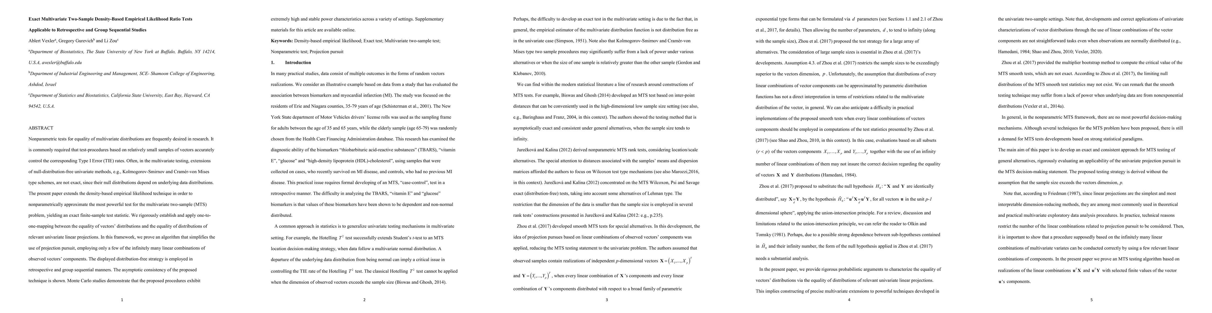 This paper presents an exact multivariate two-sample density-based empirical likelihood ratio test for small sample sizes, applicable to retrospective and group sequential studies. The proposed method accurately controls Type I error rates and demonstrates high and stable power through Monte Carlo simulations.