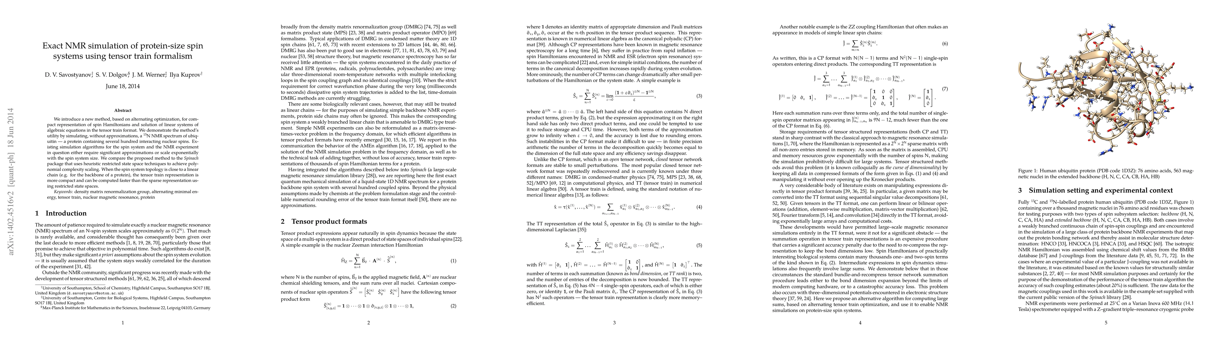 We introduce a new method, based on alternating optimization, for compact representation of spin Hamiltonians and solution of linear systems of algebraic equations in the tensor train format. We demonstrate the method's utility by simulating, without approximations, a 15N NMR spectrum of ubiquitin --- a protein containing several hundred interacting nuclear spins. Existing simulation algorithms for the spin system and the NMR experiment in question either require significant approximations or scale exponentially with the spin system size. We compare the proposed method to the Spinach package that uses heuristic restricted state space techniques to achieve polynomial complexity scaling. When the spin system topology is close to a linear chain (e.g. for the backbone of a protein), the tensor train representation is more compact and can be computed faster than the sparse representation using restricted state spaces.