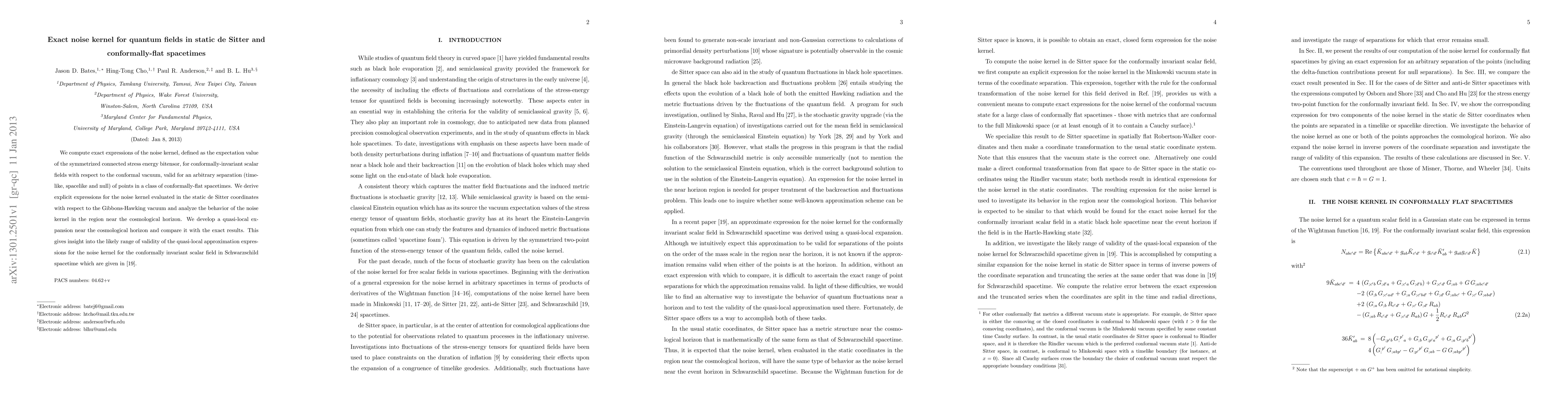 This paper computes exact expressions for the noise kernel of conformally-invariant scalar fields in conformally-flat spacetimes, focusing on static de Sitter coordinates and analyzing behavior near the cosmological horizon. It compares quasi-local approximations with exact results to assess the validity of these approximations.