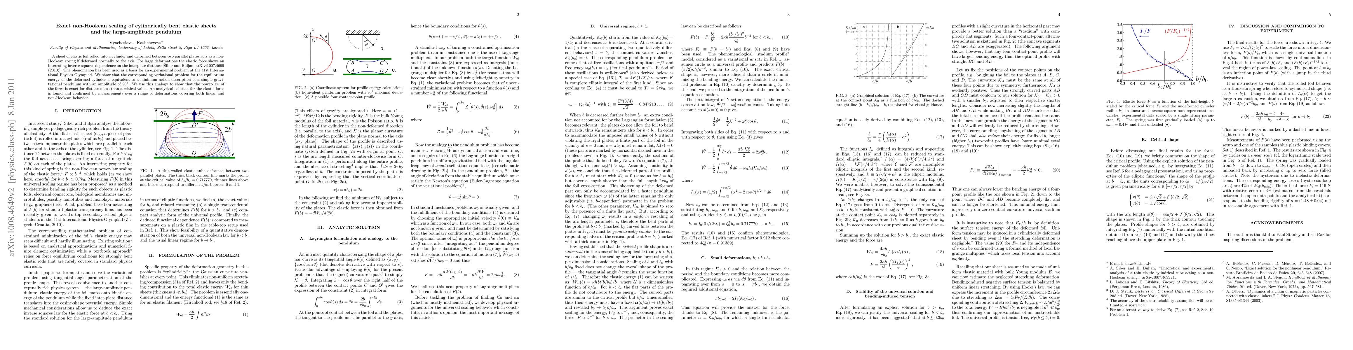 A sheet of elastic foil rolled into a cylinder and deformed between two parallel plates acts as a non-Hookean spring if deformed normally to the axis. For large deformations the elastic force shows an interesting inverse squares dependence on the interplate distance [Siber and Buljan, arXiv:1007.4699 (2010)]. The phenomenon has been used as a basis for an experimental problem at the 41st International Physics Olympiad. We show that the corresponding variational problem for the equilibrium energy of the deformed cylinder is equivalent to a minimum action description of a simple gravitational pendulum with an amplitude of 90 degrees. We use this analogy to show that the power-law of the force is exact for distances less than a critical value. An analytical solution for the elastic force is found and confirmed by measurements over a range of deformations covering both linear and non-Hookean behavior.