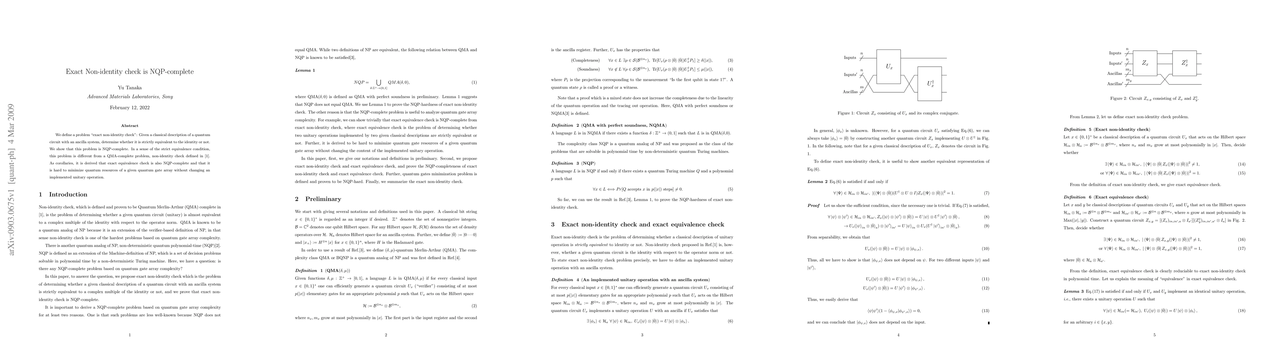 We define a problem "exact non-identity check": Given a classical description of a quantum circuit with an ancilla system, determine whether it is strictly equivalent to the identity or not. We show that this problem is NQP-complete. In a sense of the strict equivalence condition, this problem is different from a QMA-complete problem, non-identity check defined by D. Janzing etc. As corollaries, it is derived that exact equivalence check is also NQP-complete and that it is hard to minimize quantum resources of a given quantum gate array without changing an implemented unitary operation.