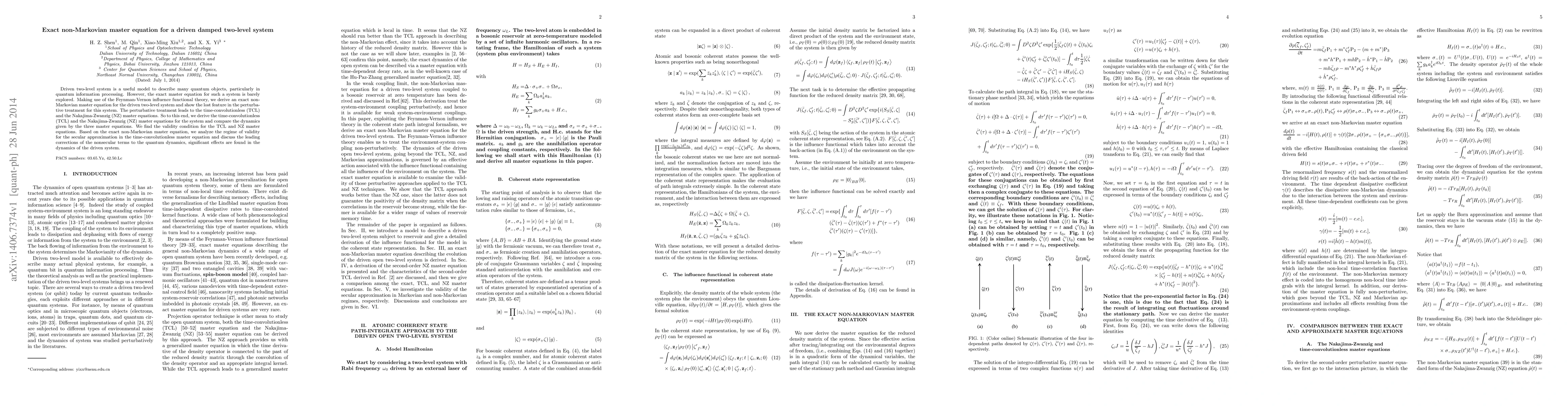 This paper derives an exact non-Markovian master equation for a driven damped two-level system using Feynman-Vernon influence functional theory, contrasting it with perturbative treatments like the TCL and NZ master equations. It highlights significant non-Markovian effects and discusses the validity of the secular approximation.