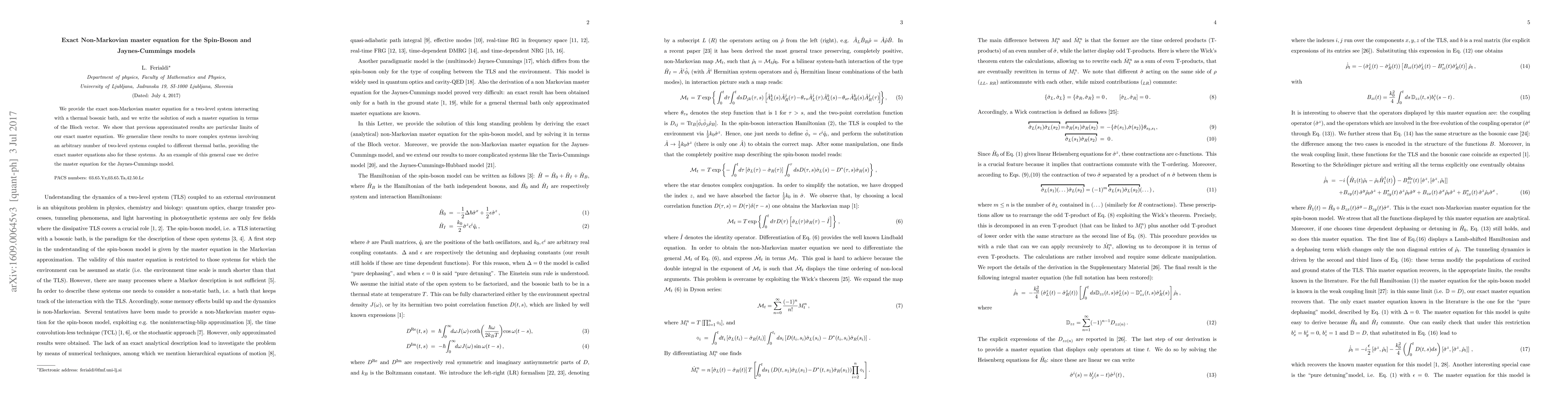 This paper presents an exact non-Markovian master equation for two-level systems interacting with thermal bosonic baths, expressed in terms of the Bloch vector. It generalizes these results to multiple coupled systems, including the Jaynes-Cummings model, showing that previous approximations are special cases of the derived exact equations.