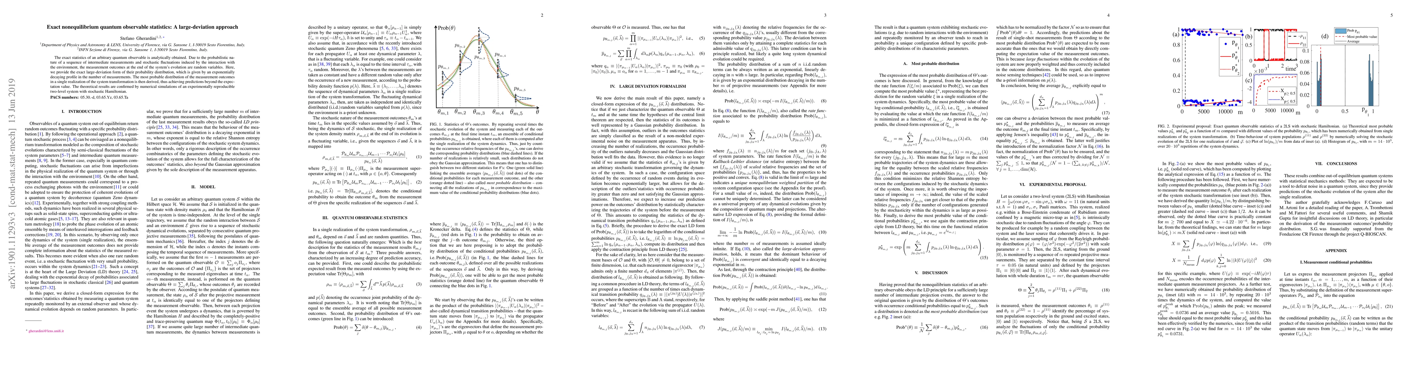 The exact statistics of an arbitrary quantum observable is analytically obtained. Due to the probabilistic nature of a sequence of intermediate measurements and stochastic fluctuations induced by the interaction with the environment, the measurement outcomes at the end of the system's evolution are random variables. Here, we provide the exact large-deviation form of their probability distribution, which is given by an exponentially decaying profile in the number of measurements. The most probable distribution of the measurement outcomes in a single realization of the system transformation is then derived, thus achieving predictions beyond the expectation value. The theoretical results are confirmed by numerical simulations of an experimentally reproducible two-level system with stochastic Hamiltonian.