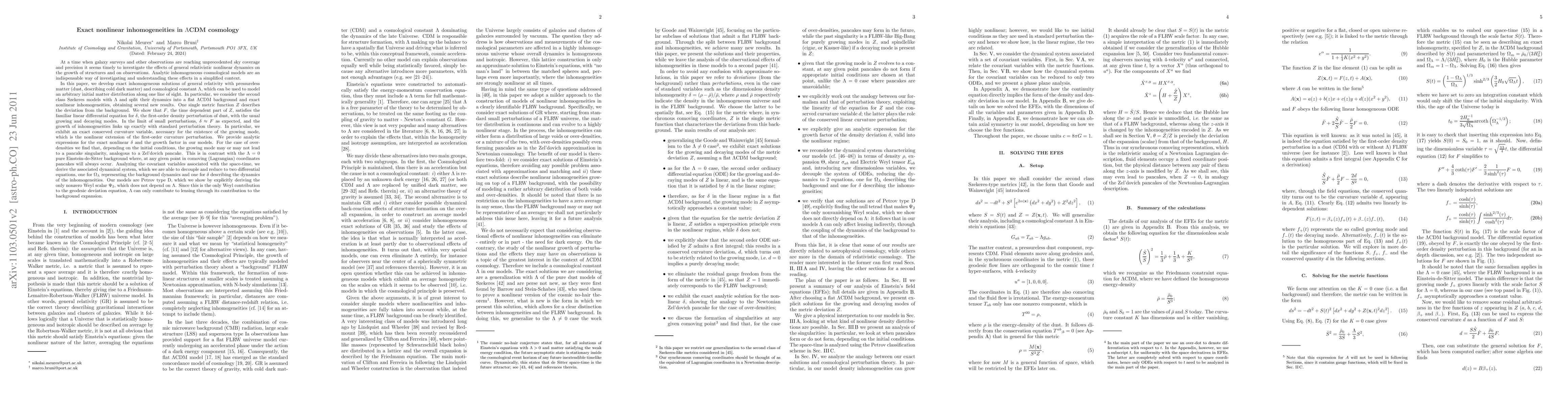 At a time when galaxy surveys and other observations are reaching unprecedented sky coverage and precision it seems timely to investigate the effects of general relativistic nonlinear dynamics on the growth of structures and on observations. Analytic inhomogeneous cosmological models are an indispensable way of investigating and understanding these effects in a simplified context. In this paper, we develop exact inhomogeneous solutions of general relativity with pressureless matter (dust, describing cold dark matter) and cosmological constant $\Lambda$, which can be used to model an arbitrary initial matter distribution along one line of sight. In particular, we consider the second class Szekeres models with $\Lambda$ and split their dynamics into a flat $\Lambda$CDM background and exact nonlinear inhomogeneities, obtaining several new results. One single metric function $Z$ describes the deviation from the background. We show that $F$, the time dependent part of $Z$, satisfies the familiar linear differential equation for $\delta$, the first-order density perturbation of dust, with the usual growing and decaying modes. In the limit of small perturbations, $\delta \approx F$ as expected, and the growth of inhomogeneities links up exactly with standard perturbation theory. We provide analytic expressions for the exact nonlinear $\delta$ and the growth factor in our models. For the case of over-densities, we find that, depending on the initial conditions, the growing mode may or may not lead to a pancake singularity, analogous to a Zel'dovich pancake. This is in contrast with the $\Lambda=0$ pure Einstein-de-Sitter background where, at any given point in comoving (Lagrangian) coordinates pancakes will always occur.