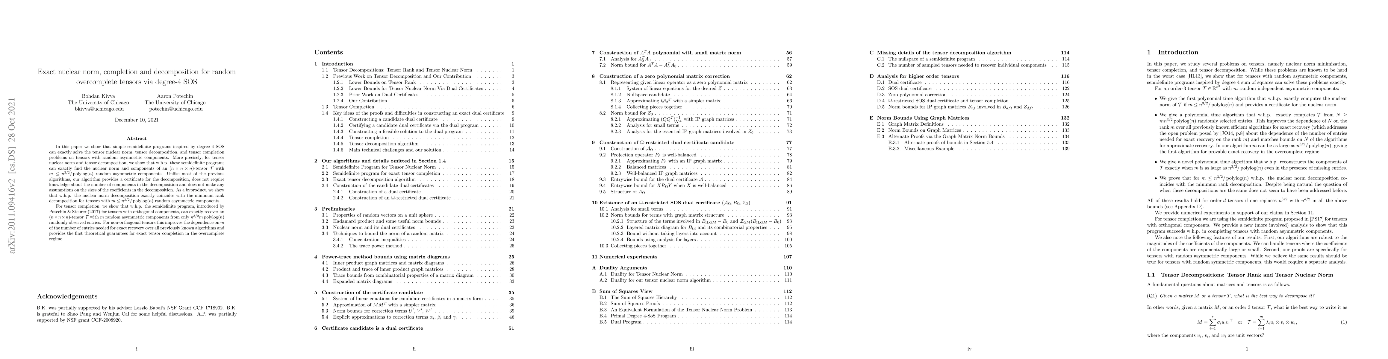 In this paper we show that simple semidefinite programs inspired by degree $4$ SOS can exactly solve the tensor nuclear norm, tensor decomposition, and tensor completion problems on tensors with random asymmetric components. More precisely, for tensor nuclear norm and tensor decomposition, we show that w.h.p. these semidefinite programs can exactly find the nuclear norm and components of an $(n\times n\times n)$-tensor $\mathcal{T}$ with $m\leq n^{3/2}/polylog(n)$ random asymmetric components. Unlike most of the previous algorithms, our algorithm provides a certificate for the decomposition, does not require knowledge about the number of components in the decomposition and does not make any assumptions on the sizes of the coefficients in the decomposition. As a byproduct, we show that w.h.p. the nuclear norm decomposition exactly coincides with the minimum rank decomposition for tensors with $m\leq n^{3/2}/polylog(n)$ random asymmetric components. For tensor completion, we show that w.h.p. the semidefinite program, introduced by Potechin & Steurer (2017) for tensors with orthogonal components, can exactly recover an $(n\times n\times n)$-tensor $\mathcal{T}$ with $m$ random asymmetric components from only $n^{3/2}m polylog(n)$ randomly observed entries. For non-orthogonal tensors, this improves the dependence on $m$ of the number of entries needed for exact recovery over all previously known algorithms and provides the first theoretical guarantees for exact tensor completion in the overcomplete regime.