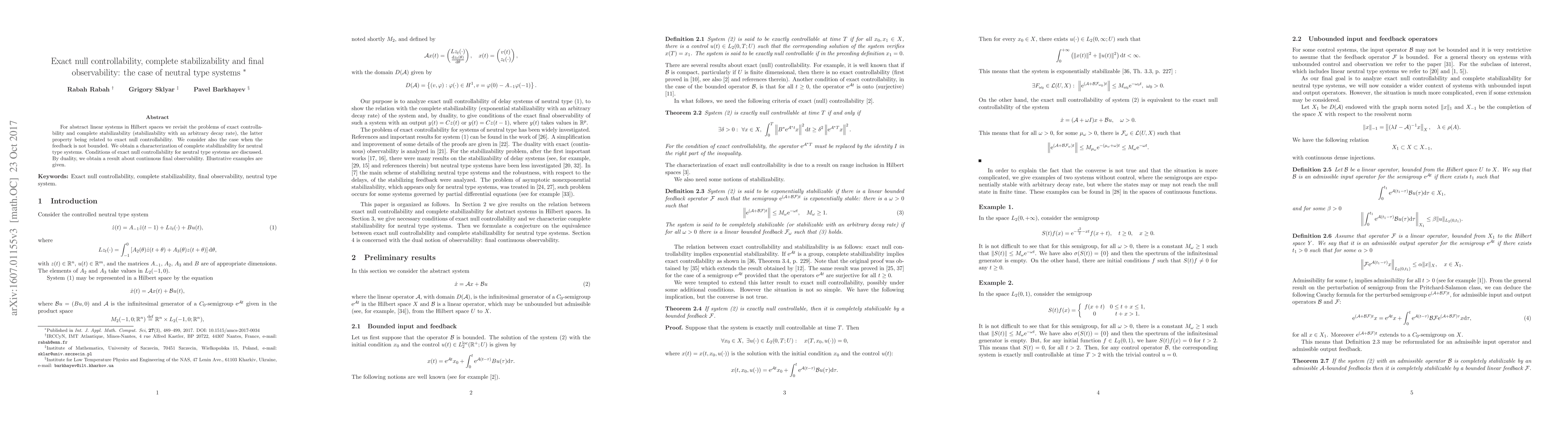 For abstract linear systems in Hilbert spaces we revisit the problems of exact controllability and complete stabilizability (stabilizability with an arbitrary decay rate), the latter property is equivalent to exact null controllability. We extend this result to the case when the feedback is not bounded. This enables the characterization of exact null controllability and complete stabilizability for neutral type systems. By duality, we obtain a result about continuous final observability.Illustrative examples are given.
