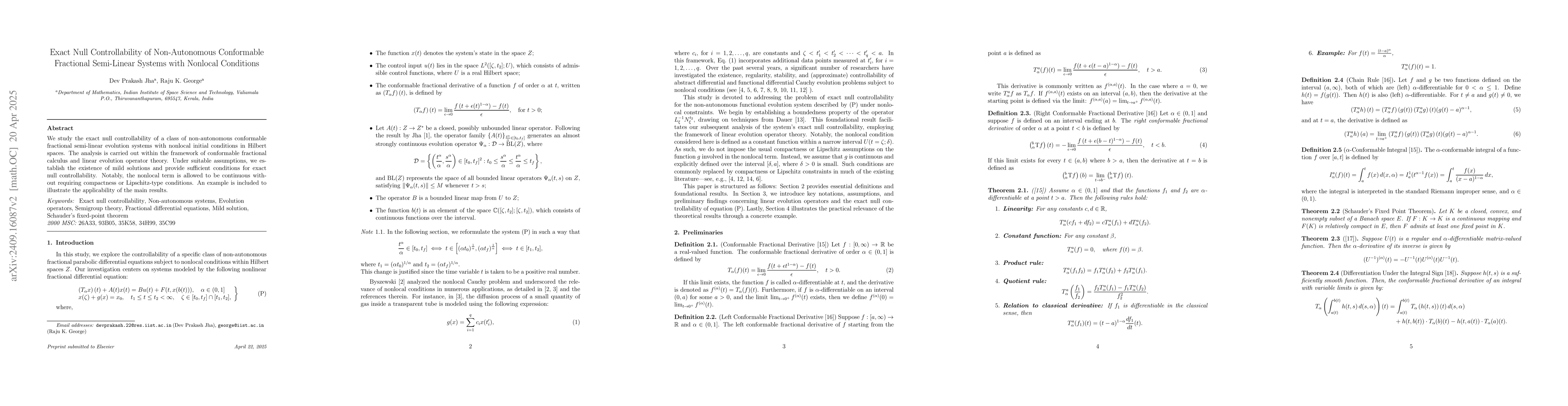 This paper establishes sufficient conditions for exact null controllability in non-autonomous conformable fractional semi-linear systems with nonlocal conditions in Hilbert spaces, using linear evolution systems and the Schauder fixed point theorem, without requiring compactness or Lipschitz conditions on \( g \). An example is provided to illustrate practical applications.