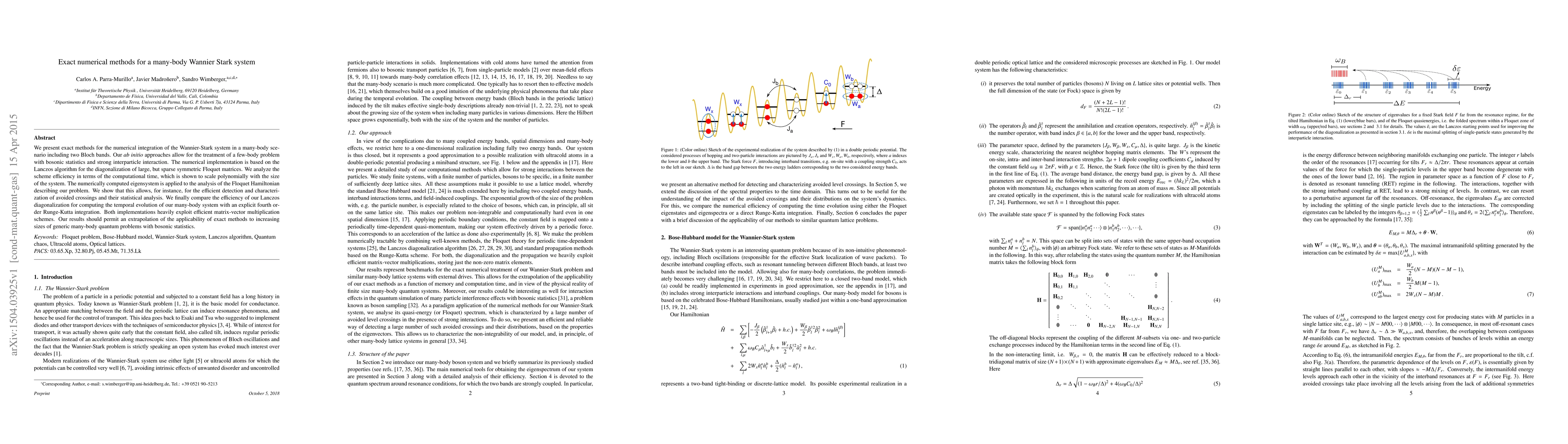 We present exact methods for the numerical integration of the Wannier-Stark system in a many-body scenario including two Bloch bands. Our ab initio approaches allow for the treatment of a few-body problem with bosonic statistics and strong interparticle interaction. The numerical implementation is based on the Lanczos algorithm for the diagonalization of large, but sparse symmetric Floquet matrices. We analyze the scheme efficiency in terms of the computational time, which is shown to scale polynomially with the size of the system. The numerically computed eigensystem is applied to the analysis of the Floquet Hamiltonian describing our problem. We show that this allows, for instance, for the efficient detection and characterization of avoided crossings and their statistical analysis. We finally compare the efficiency of our Lanczos diagonalization for computing the temporal evolution of our many-body system with an explicit fourth order Runge-Kutta integration. Both implementations heavily exploit efficient matrix-vector multiplication schemes. Our results should permit an extrapolation of the applicability of exact methods to increasing sizes of generic many-body quantum problems with bosonic statistics.