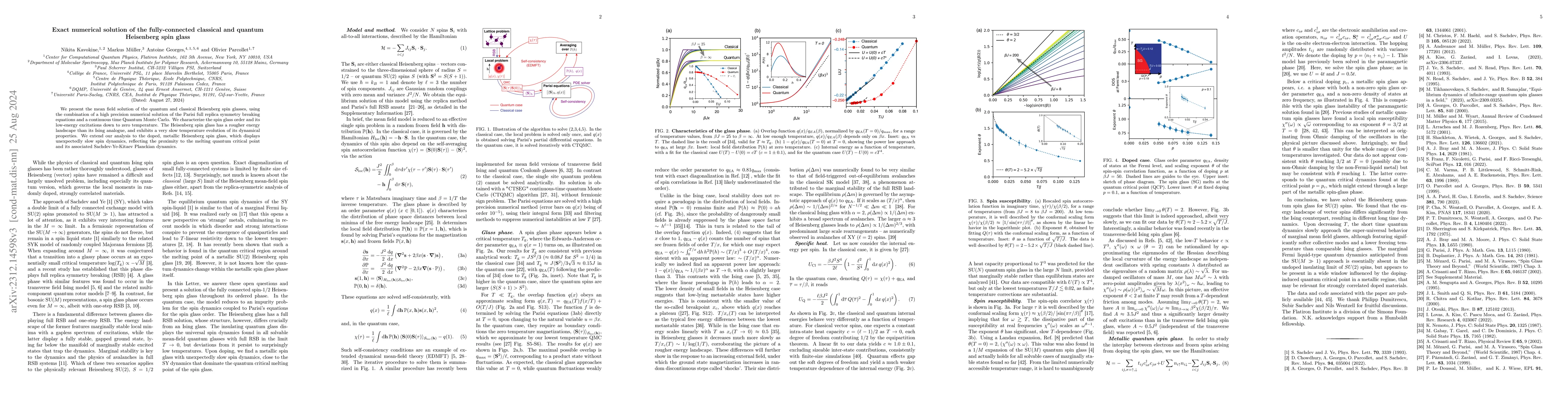 This paper presents an exact numerical solution for both classical and quantum Heisenberg spin glasses, revealing a complex energy landscape and slow temperature evolution of dynamical properties. The study also explores doped metallic variants, highlighting slow spin dynamics near a quantum critical point.