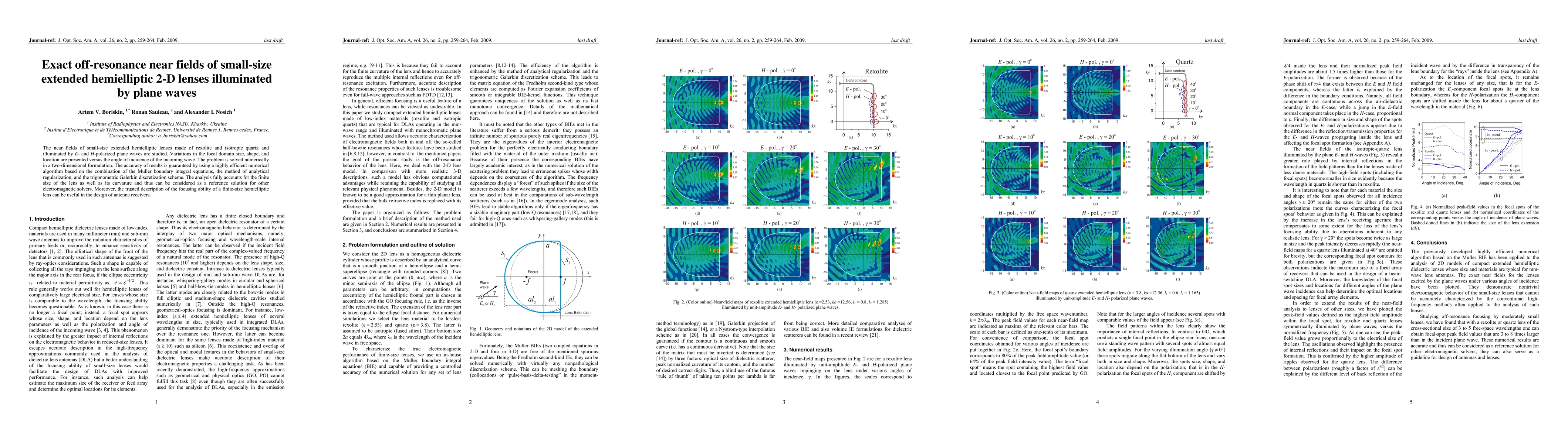The near fields of small-size extended hemielliptic lenses made of rexolite and isotropic quartz and illuminated by E- and H-polarized plane waves are studied. Variations in the focal domain size, shape, and location are presented versus the angle of incidence of the incoming wave. The problem is solved numerically in a two-dimensional formulation. The accuracy of results is guaranteed by using a highly efficient numerical algorithm based on the combination of the Muller boundary integral equations, the method of analytical regularization, and the trigonometric Galerkin discretization scheme. The analysis fully accounts for the finite size of the lens as well as its curvature and thus can be considered as a reference solution for other electromagnetic solvers. Moreover, the trusted description of the focusing ability of a finite-size hemielliptic lens can be useful in the design of antenna receivers.