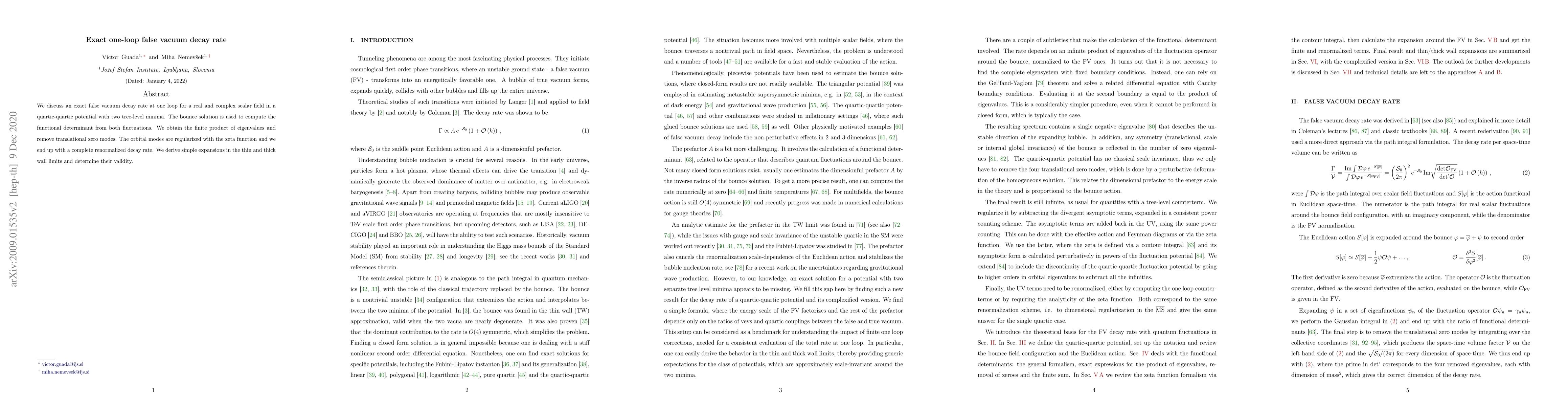 We discuss an exact false vacuum decay rate at one loop for a real and complex scalar field in a quartic-quartic potential with two tree-level minima. The bounce solution is used to compute the functional determinant from both fluctuations. We obtain the finite product of eigenvalues and remove translational zero modes. The orbital modes are regularized with the zeta function and we end up with a complete renormalized decay rate. We derive simple expansions in the thin and thick wall limits and determine their validity.