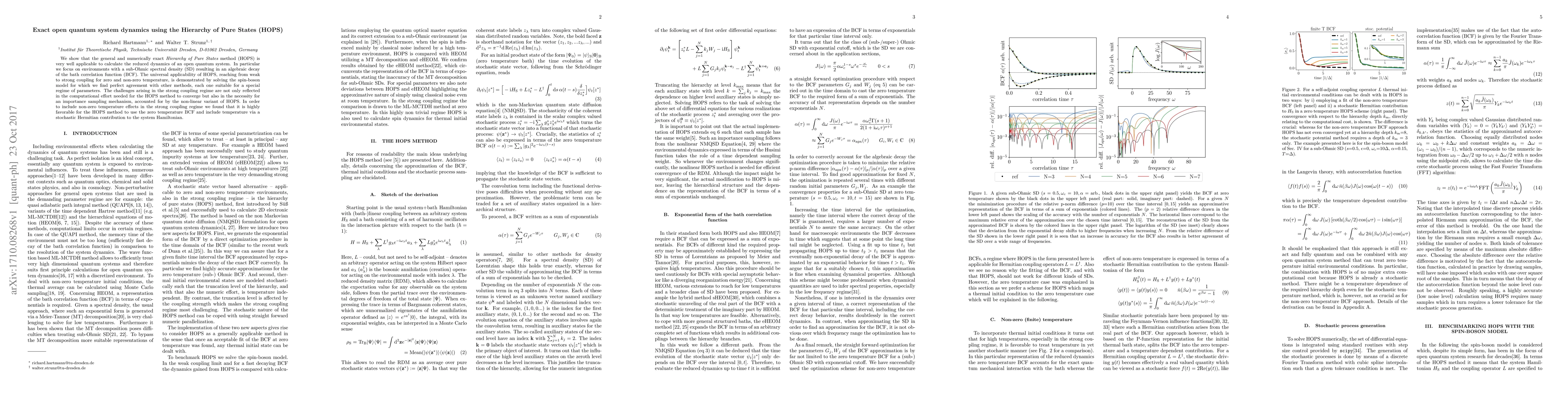 The Hierarchy of Pure States (HOPS) method provides an exact numerical approach for calculating the dynamics of open quantum systems, particularly effective for sub-Ohmic environments. It demonstrates universal applicability across various coupling regimes and temperatures, achieving perfect agreement with other methods for the spin-boson model.