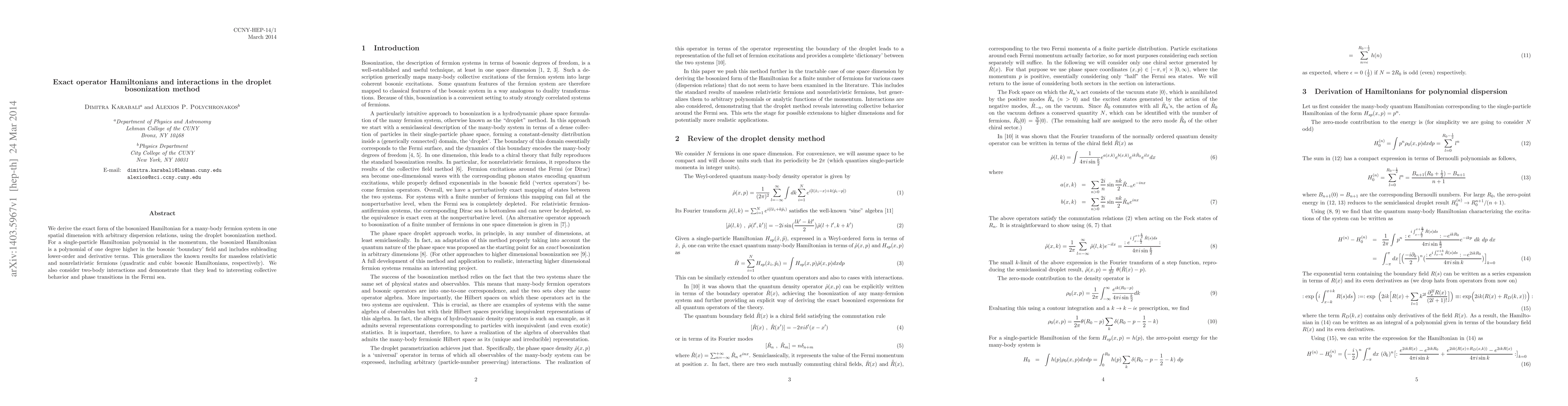 We derive the exact form of the bosonized Hamiltonian for a many-body fermion system in one spatial dimension with arbitrary dispersion relations, using the droplet bosonization method. For a single-particle Hamiltonian polynomial in the momentum, the bosonized Hamiltonian is a polynomial of one degree higher in the bosonic "boundary" field and includes subleading lower-order and derivative terms. This generalizes the known results for massless relativistic and nonrelativistic fermions (quadratic and cubic bosonic Hamiltonians, respectively). We also consider two-body interactions and demonstrate that they lead to interesting collective behavior and phase transitions in the Fermi sea.