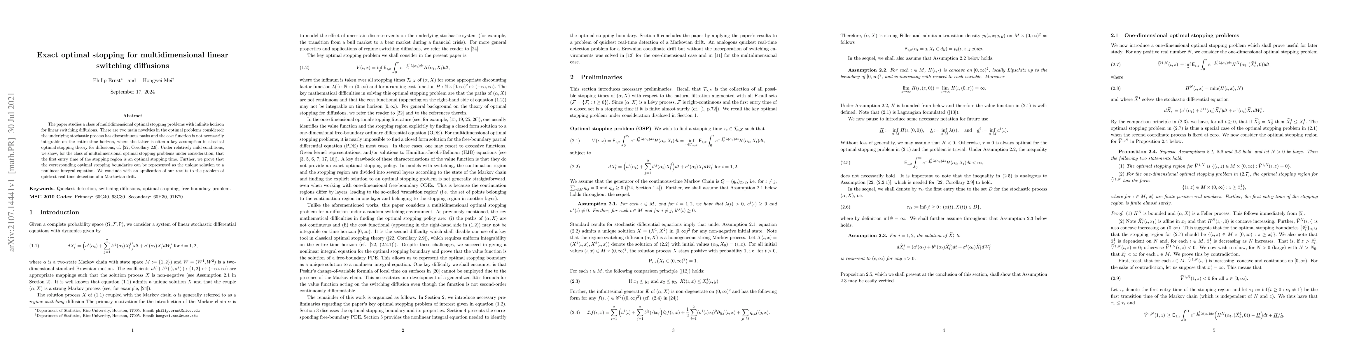 The paper studies a class of multidimensional optimal stopping problems with infinite horizon for linear switching diffusions. There are two main novelties in the optimal problems considered: the underlying stochastic process has discontinuous paths and the cost function is not necessarily integrable on the entire time horizon, where the latter is often a key assumption in classical optimal stopping theory for diffusions, cf. [22, Corollary 2.9]. Under relatively mild conditions, we show, for the class of multidimensional optimal stopping problems under consideration, that the first entry time of the stopping region is an optimal stopping time. Further, we prove that the corresponding optimal stopping boundaries can be represented as the unique solution to a nonlinear integral equation. We conclude with an application of our results to the problem of quickest real-time detection of a Markovian drift.