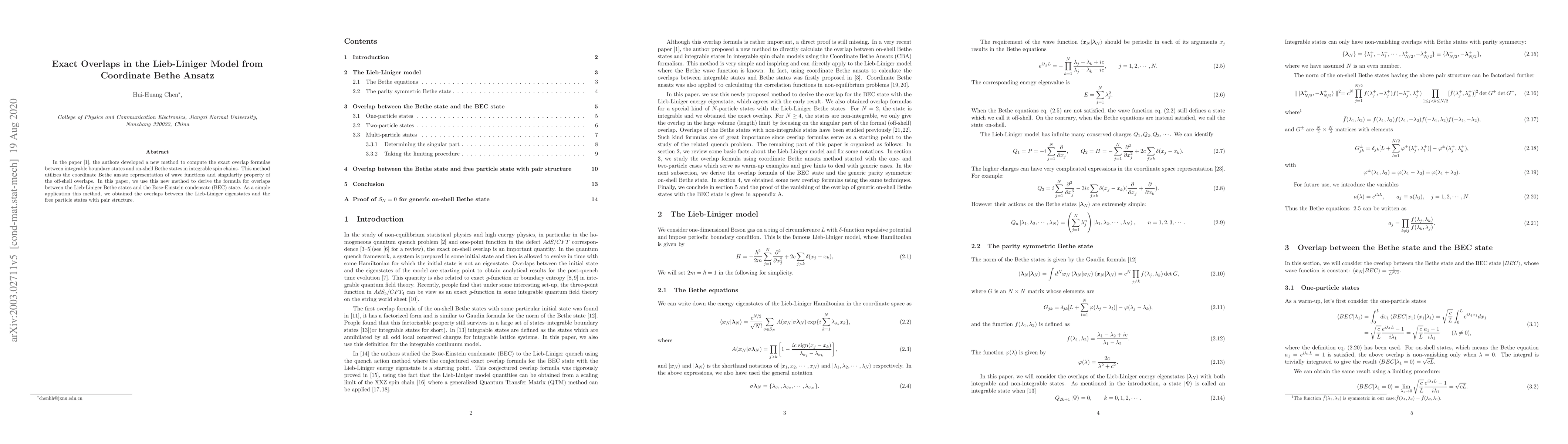 In the paper arXiv:2002.12065, the authors developed a new method to compute the exact overlap formulas between integrable boundary states and on-shell Bethe states in integrable spin chains. This method utilizes the coordinate Bethe ansatz representation of wave functions and singularity property of the off-shell overlaps. In this paper, we use this new method to derive the formula for overlaps between the Lieb-Liniger Bethe states and the Bose-Einstein condensate (BEC) state. As a simple application this method, we obtained the overlaps between the Lieb-Liniger eigenstates and the free particle states with pair structure.