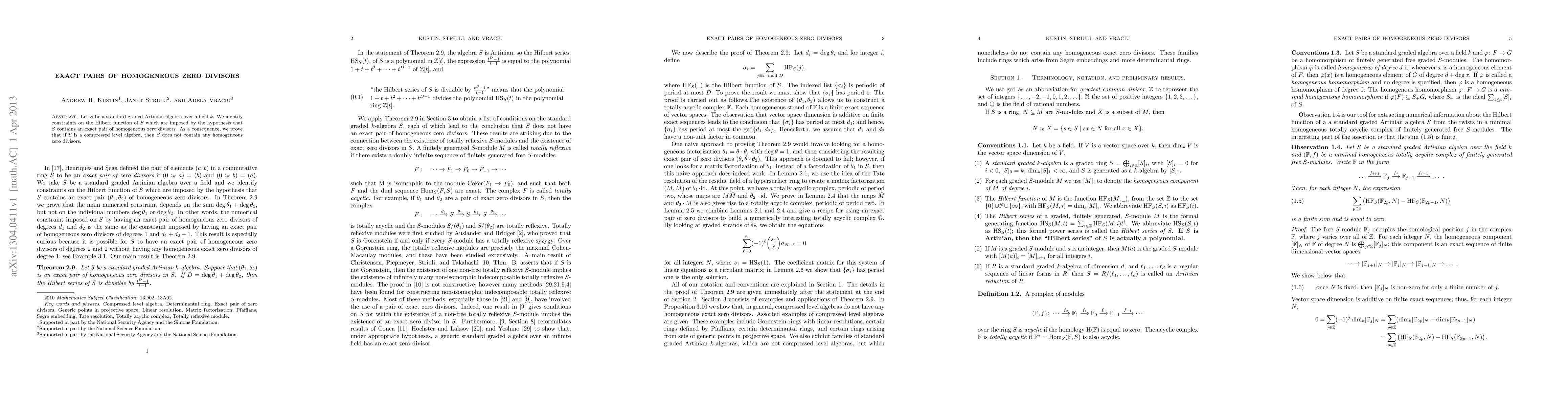 Let S be a standard graded Artinian algebra over a field k. We identify constraints on the Hilbert function of S which are imposed by the hypothesis that S contains an exact pair of homogeneous zero divisors. As a consequence, we prove that if S is a compressed level algebra, then S does not contain any homogeneous zero divisors.