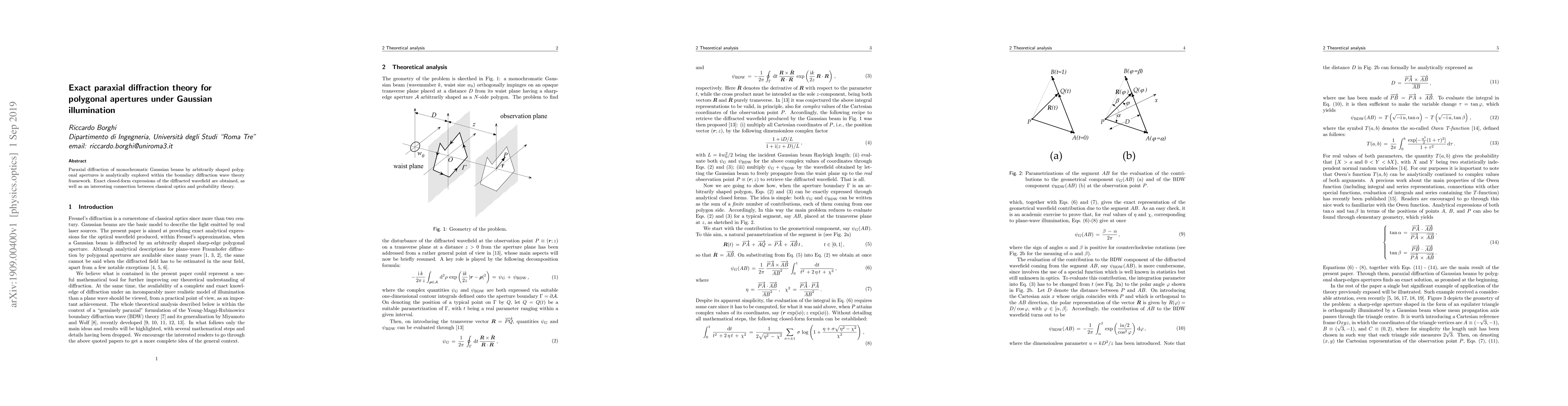 This paper develops an exact analytical framework for the paraxial diffraction of Gaussian beams through polygonal apertures, deriving closed-form expressions for the diffracted wavefield and highlighting a unique link between classical optics and probability theory.