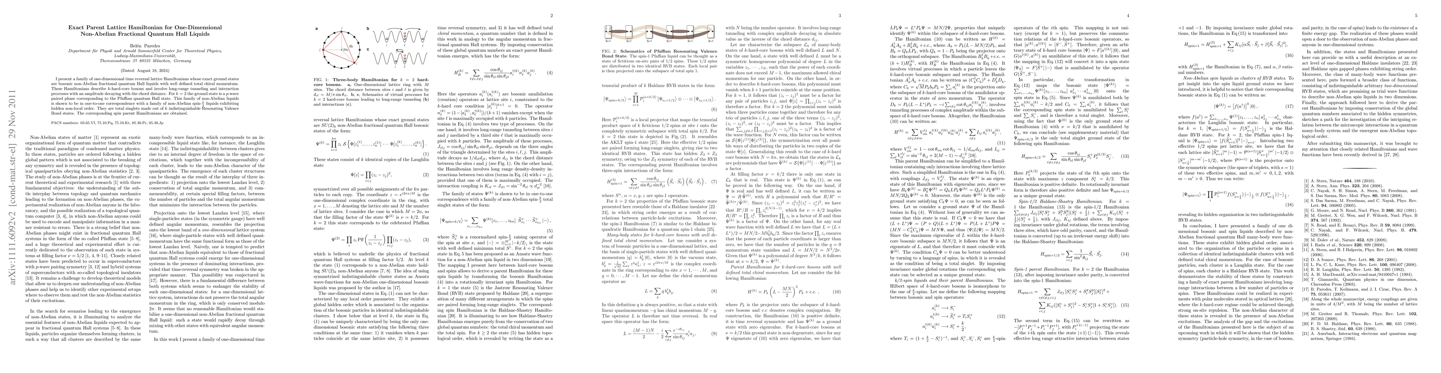 I present a family of one-dimensional time reversal lattice Hamiltonians whose exact ground states are bosonic non-Abelian fractional quantum Hall liquids with well defined total chiral momentum. These Hamiltonians describe k-hard-core bosons and involve long-range tunneling and interaction processes with an amplitude decaying with the chord distance. For k=2 the ground state is a p-wave paired phase corresponding to the Pfaffian quantum Hall state. This family of non-Abelian liquids is shown to be in one-to-one correspondence with a family of non-Abelian spin-k/2 liquids exhibiting hidden non-local order. They are total singlets made out of k indistinguishable Resonating Valence Bond states. The corresponding spin parent Hamiltonians are obtained.