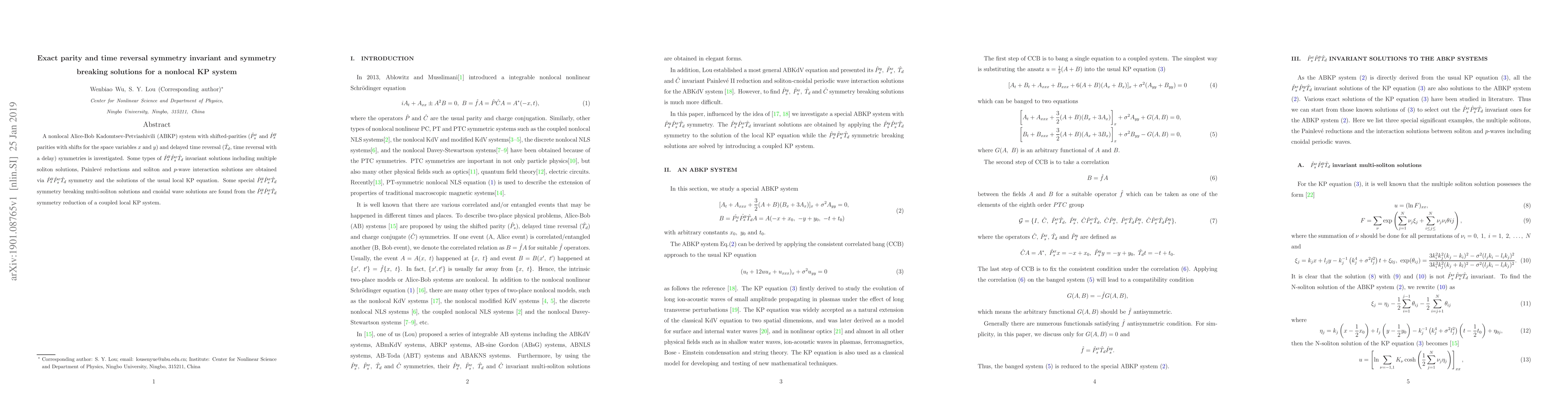 This paper investigates a nonlocal Alice-Bob Kadomtsev-Petviashivili (ABKP) system with shifted-parities and delayed time reversal symmetries, deriving invariant solutions including solitons and multi-soliton interactions. It also explores symmetry breaking solutions via symmetry reduction of a coupled local KP system.