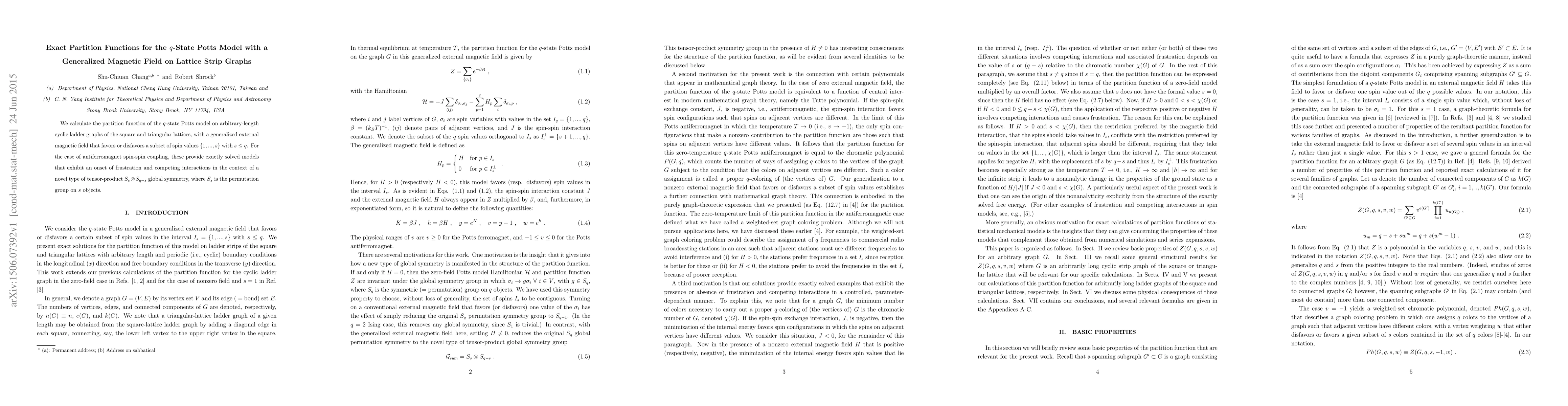 This paper calculates the partition function for the $q$-state Potts model on cyclic ladder graphs of square and triangular lattices under a generalized magnetic field. It introduces a novel tensor-product symmetry $S_s \otimes S_{q-s}$ and explores frustration and competing interactions in the antiferromagnet spin-spin coupling scenario.