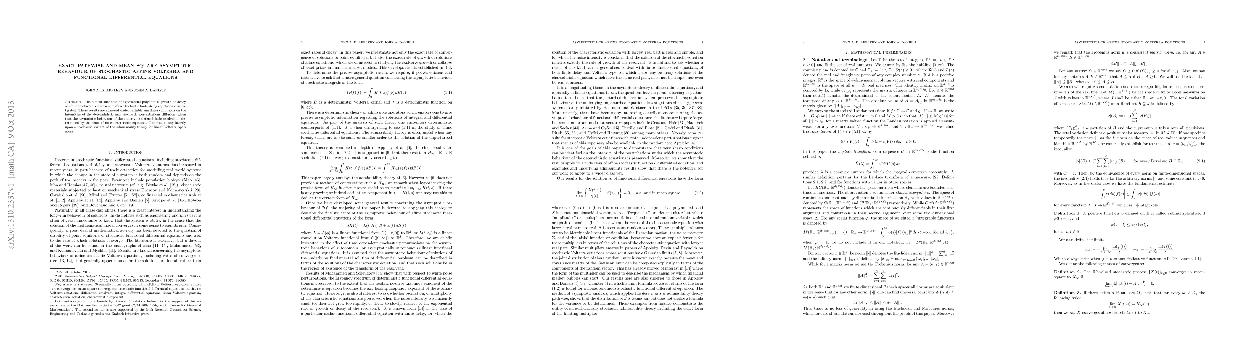 The almost sure rate of exponential-polynomial growth or decay of affine stochastic Volterra and affine stochastic finite-delay equations is investigated. These results are achieved under suitable smallness conditions on the intensities of the deterministic and stochastic perturbations diffusion, given that the asymptotic behaviour of the underlying deterministic resolvent is determined by the zeros of its characteristic equation. The results rely heavily upon a stochastic variant of the admissibility theory for linear Volterra operators.