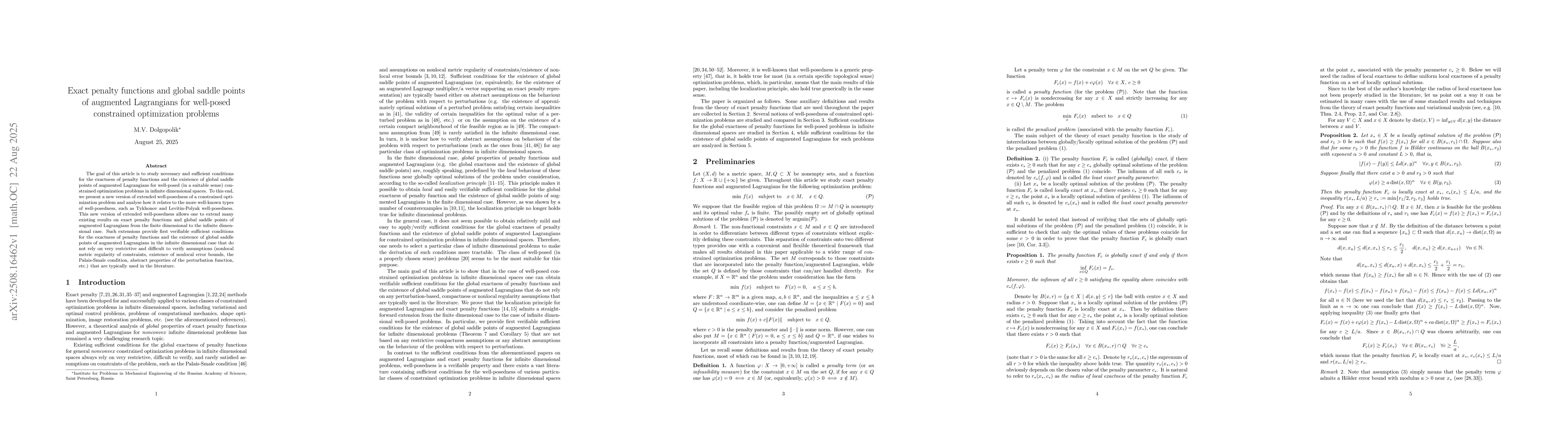 The goal of this article is to study necessary and sufficient conditions for the exactness of penalty functions and the existence of global saddle points of augmented Lagrangians for well-posed (in a suitable sense) constrained optimization problems in infinite dimensional spaces. To this end, we present a new version of extended well-posedness of a constrained optimization problem and analyse how it relates to the more well-known types of well-posedness, such as Tykhonov and Levitin-Polyak well-posedness. This new version of extended well-posedness allows one to extend many existing results on exact penalty functions and global saddle points of augmented Lagrangians from the finite dimensional to the infinite dimensional case. Such extensions provide first verifiable sufficient conditions for the exactness of penalty functions and the existence of global saddle points of augmented Lagrangians in the infinite dimensional case that do not rely on very restrictive and difficult to verify assumptions (nonlocal metric regularity of constraints, existence of nonlocal error bounds, the Palais-Smale condition, abstract properties of the perturbation function, etc.) that are typically used in the literature.