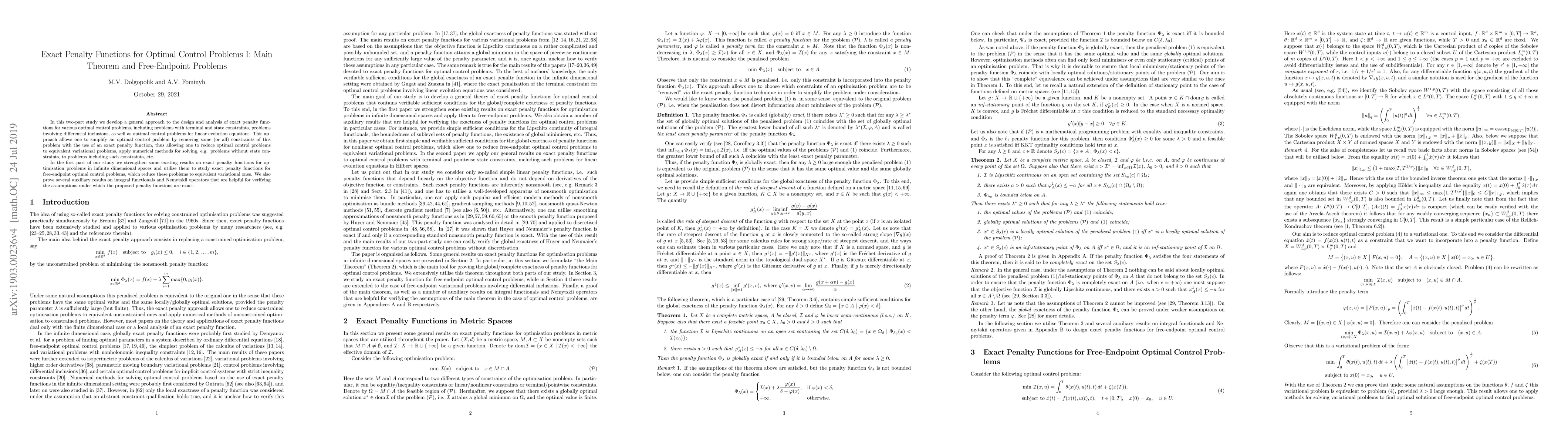 In this two-part study we develop a general approach to the design and analysis of exact penalty functions for various optimal control problems, including problems with terminal and state constraints, problems involving differential inclusions, as well as optimal control problems for linear evolution equations. This approach allows one to simplify an optimal control problem by removing some (or all) constraints of this problem with the use of an exact penalty function, thus allowing one to reduce optimal control problems to equivalent variational problems, apply numerical methods for solving, e.g. problems without state constraints, to problems including such constraints, etc. In the first part of our study we strengthen some existing results on exact penalty functions for optimisation problems in infinite dimensional spaces and utilise them to study exact penalty functions for free-endpoint optimal control problems, which reduce these problems to equivalent variational ones. We also prove several auxiliary results on integral functionals and Nemytskii operators that are helpful for verifying the assumptions under which the proposed penalty functions are exact.