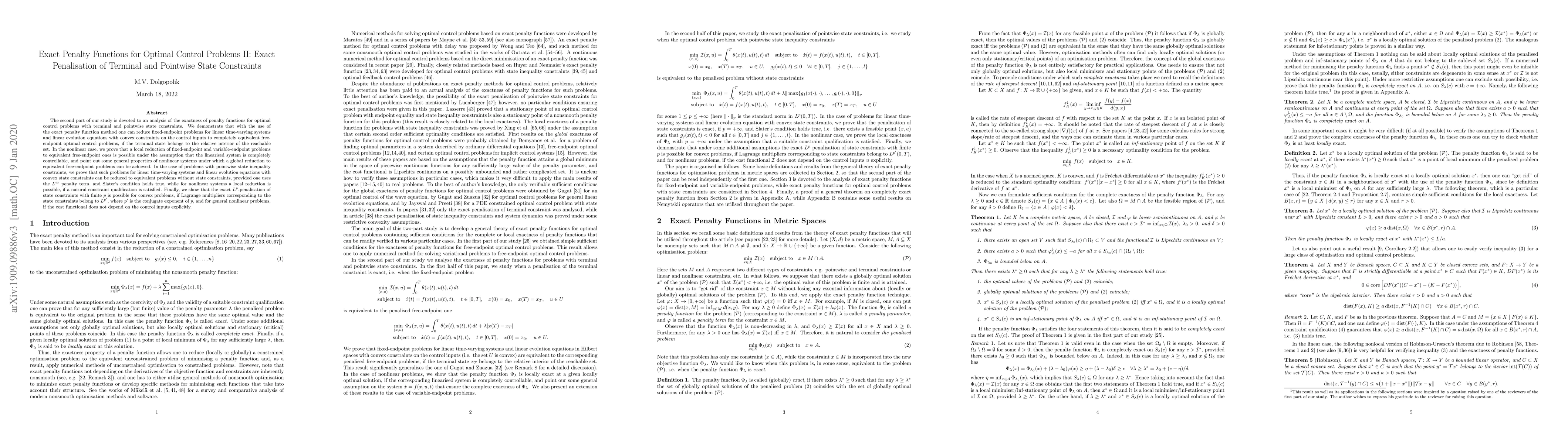 The second part of our study is devoted to an analysis of the exactness of penalty functions for optimal control problems with terminal and pointwise state constraints. We demonstrate that with the use of the exact penalty function method one can reduce fixed-endpoint problems for linear time-varying systems and linear evolution equations with convex constraints on the control inputs to completely equivalent free-endpoint optimal control problems, if the terminal state belongs to the relative interior of the reachable set. In the nonlinear case, we prove that a local reduction of fixed-endpoint and variable-endpoint problems to equivalent free-endpoint ones is possible under the assumption that the linearised system is completely controllable, and point out some general properties of nonlinear systems under which a global reduction to equivalent free-endpoint problems can be achieved. In the case of problems with pointwise state inequality constraints, we prove that such problems for linear time-varying systems and linear evolution equations with convex state constraints can be reduced to equivalent problems without state constraints, provided one uses the $L^{\infty}$ penalty term, and Slater's condition holds true, while for nonlinear systems a local reduction is possible, if a natural constraint qualification is satisfied. Finally, we show that the exact $L^p$-penalisation of state constraints with finite $p$ is possible for convex problems, if Lagrange multipliers corresponding to the state constraints belong to $L^{p'}$, where $p'$ is the conjugate exponent of $p$, and for general nonlinear problems, if the cost functional does not depend on the control inputs explicitly.