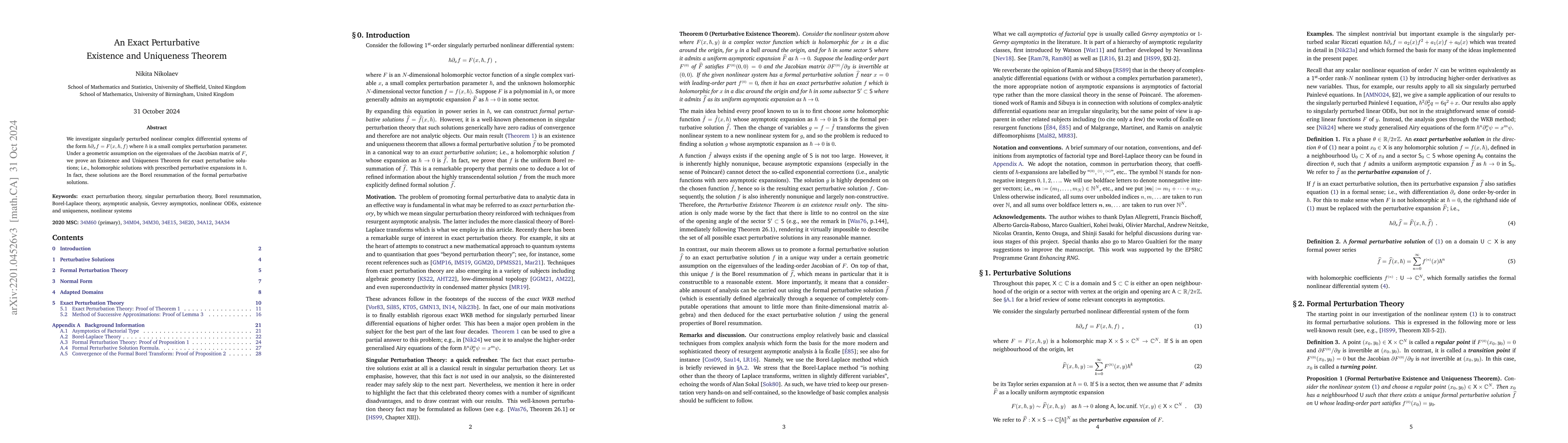 We prove a general existence and uniqueness theorem for holomorphic perturbative solutions of singularly perturbed nonlinear complex differential systems of the form $\hbar \partial_x f = F (x, \hbar, f)$ where $\hbar$ is a small complex perturbation parameter. Specifically, we give conditions that allow us to promote, in a unique and precise sense, a formal perturbative solution $\hat{f} (x, \hbar)$ to a holomorphic solution $f (x, \hbar)$ whose perturbative expansion is $\hat{f}$. Furthermore, we prove that $f$ is the uniform Borel resummation of $\hat{f}$. As sample applications, we analyse the Painlev\'e I equation as well as derive exact WKB solutions for a generalised 3\textsuperscript{rd}-order Airy equation.