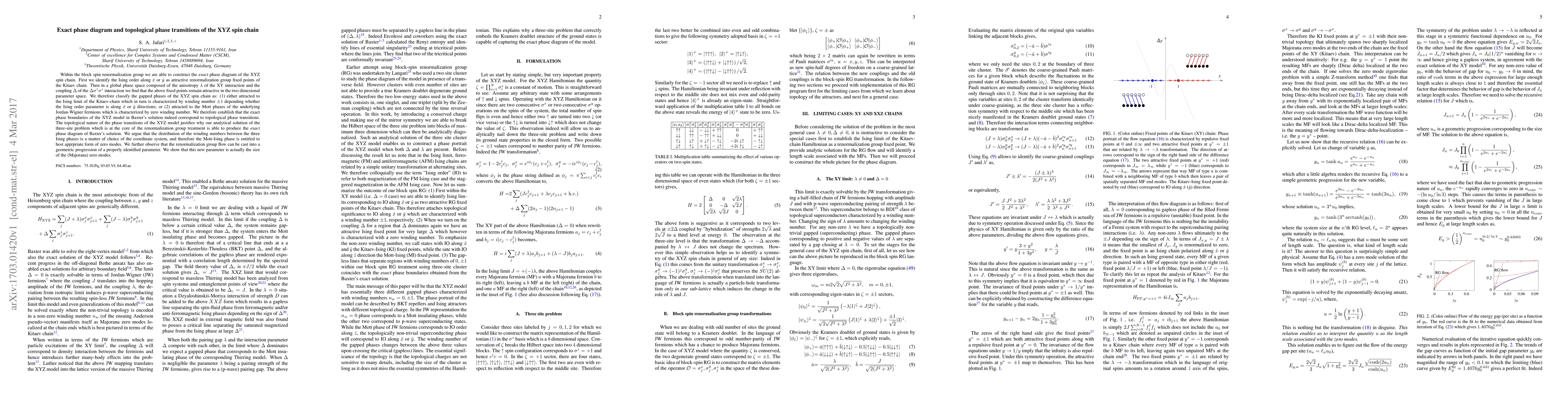 This paper constructs the exact phase diagram of the XYZ spin chain using the block spin renormalization group, identifying topological phase transitions characterized by winding numbers. The study reveals two main gapped phases: Ising-like phases with winding numbers ±1 and Mott phases with zero winding number, establishing the topological nature of the phase boundaries.