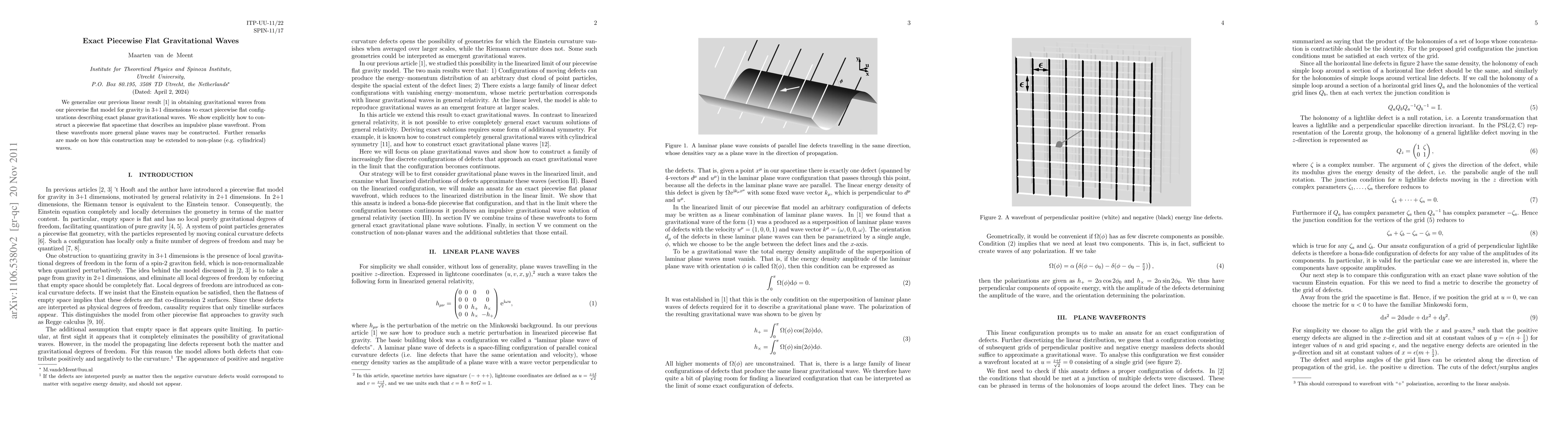 This paper generalizes previous linear results to describe exact piecewise flat configurations for gravitational waves in 3+1 dimensions, explicitly constructing a spacetime model for an impulsive plane wavefront, which can be extended to more general plane waves.
