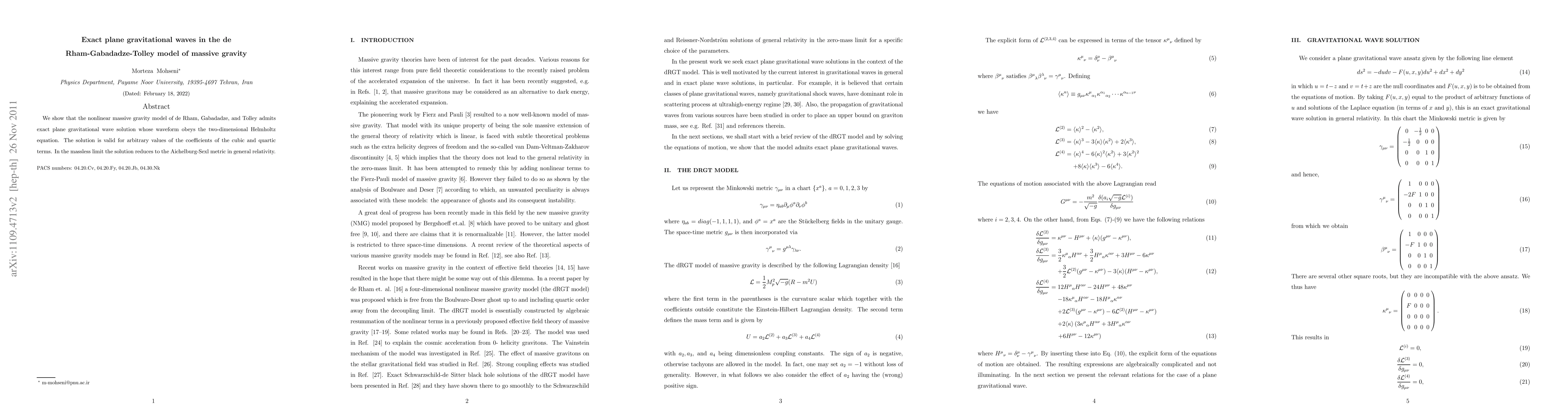 We show that the nonlinear massive gravity model of de Rham, Gabadadze, and Tolley admits exact plane gravitational wave solution whose waveform obeys the two-dimensional Helmholtz equation. The solution is valid for arbitrary values of the coefficients of the cubic and quartic terms. In the massless limit the solution reduces to the Aichelburg-Sexl metric in general relativity.