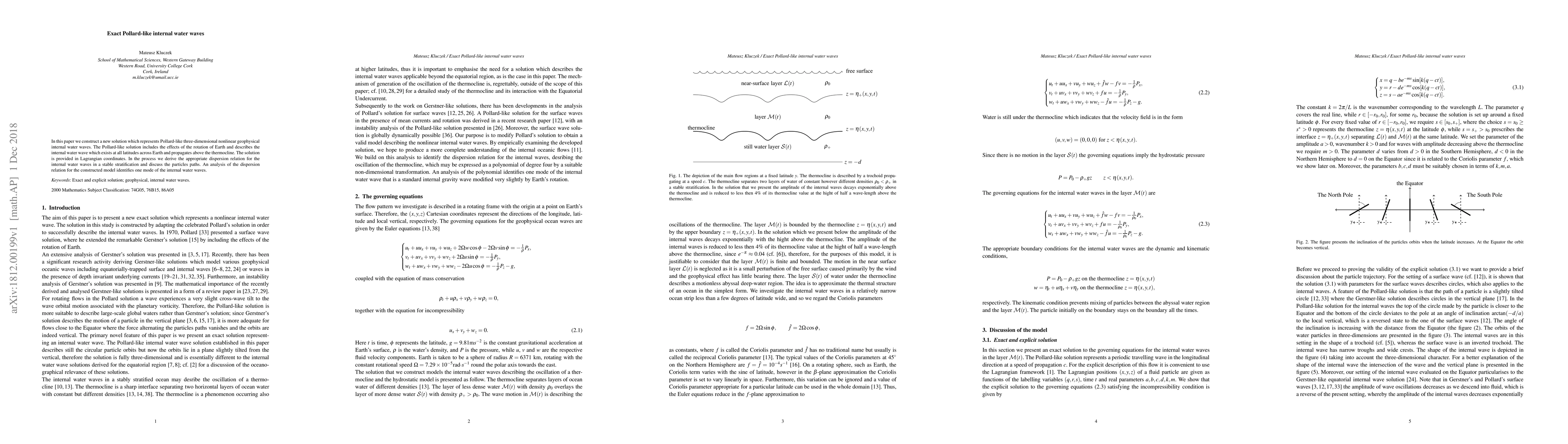 In this paper we construct a new solution which represents Pollard-like three-dimensional nonlinear geophysical internal water waves. The Pollard-like solution includes the effects of the rotation of Earth and describes the internal water wave which exists at all latitudes across Earth and propagates above the thermocline. The solution is provided in Lagrangian coordinates. In the process we derive the appropriate dispersion relation for the internal water waves in a stable stratification and discuss the particles paths. An analysis of the dispersion relation for the constructed model identifies one mode of the internal water waves.