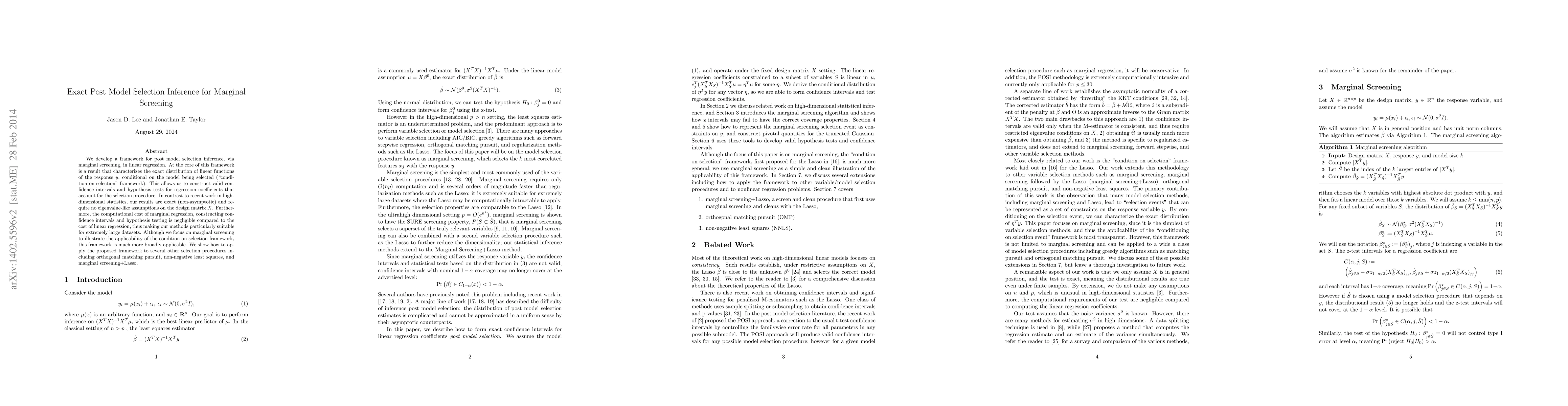 This paper introduces a framework for exact post model selection inference in linear regression using marginal screening, providing valid confidence intervals and hypothesis tests that account for the selection procedure without requiring eigenvalue assumptions. The method is computationally efficient, making it suitable for large datasets.